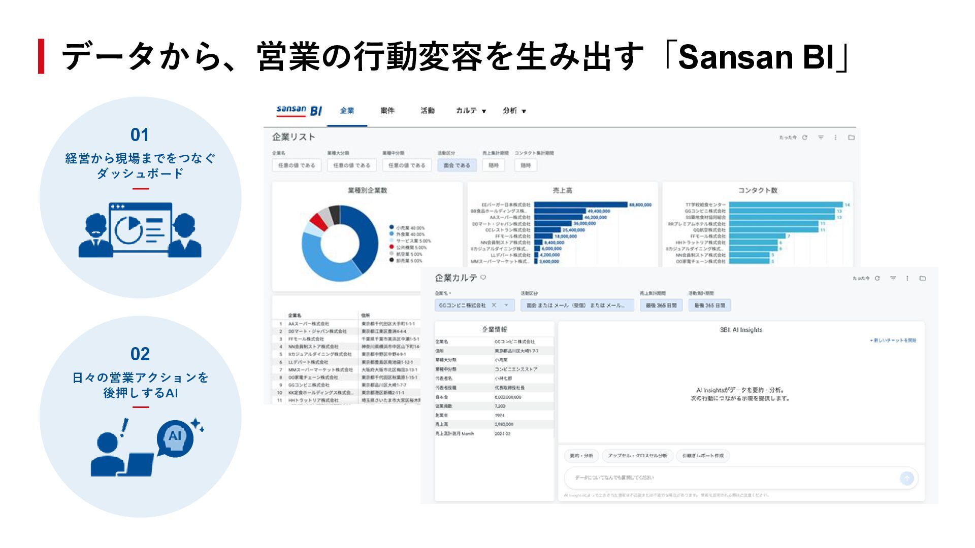 6. 数字やグラフだけでなく、 情報要約やアイデア創出により、 立体的な情報の提供・示唆の 導出を可能にする。 Sansan は「データ統合」「セミオーダーの UI」「AI による気づきの提供」で、 データ活用の壁を乗り越えます Sansan