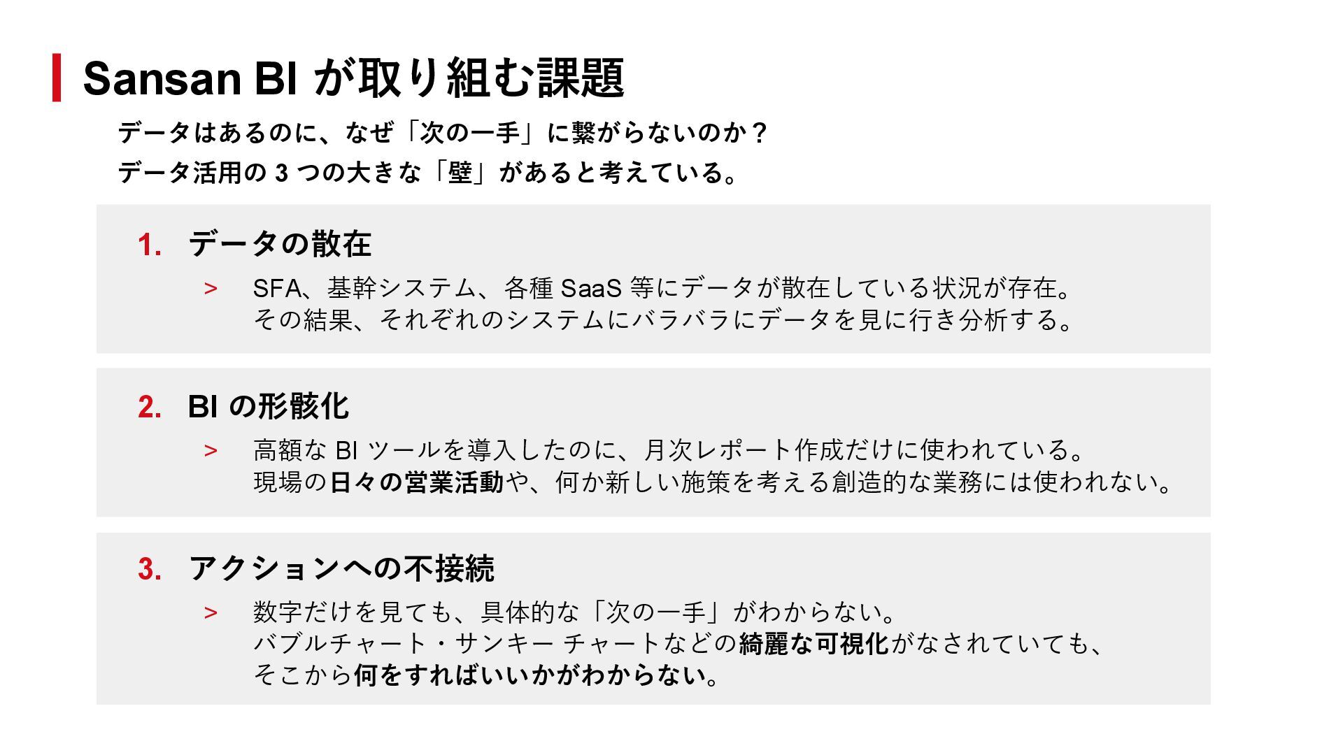 > 高額な BI ツールを導入したのに、月次レポート作成だけに使われている。 現場の日々の営業活動や、何か新しい施策を考える創造的な業務には使われない。 3. アクションへの不接続 > 数字だけを見ても、具体的な「次の一手」がわからない。 バブルチャート・サンキー チャートなどの綺麗な可視化がなされていても、 そこから何をすればいいかがわからない。 Sansan BI が取り組む課題 データはあるのに、なぜ「次の一手」に繋がらないのか? データ活用の 3 つの大きな「壁」があると考えている。
