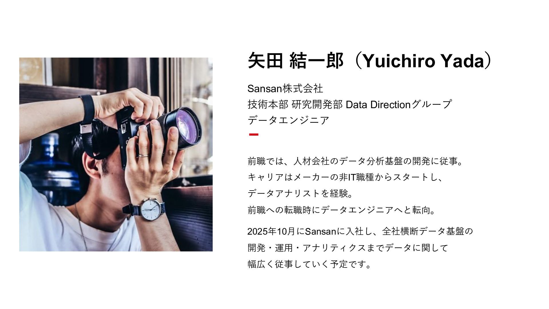 キャリアはメーカーの⾮IT職種からスタートし、 データアナリストを経験。 前職への転職時にデータエンジニアへと転向。 2025年10⽉にSansanに⼊社し、全社横断データ基盤の 開発・運⽤・アナリティクスまでデータに関して 幅広く従事していく予定です。