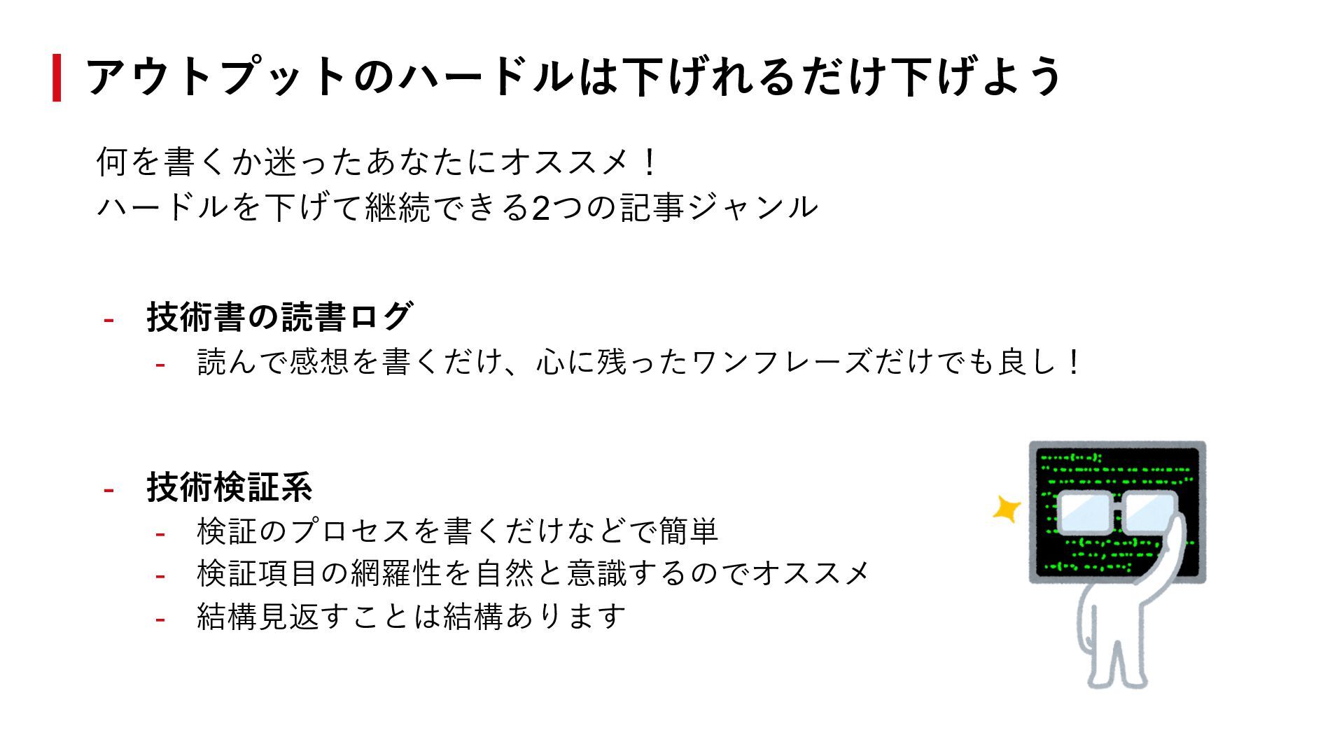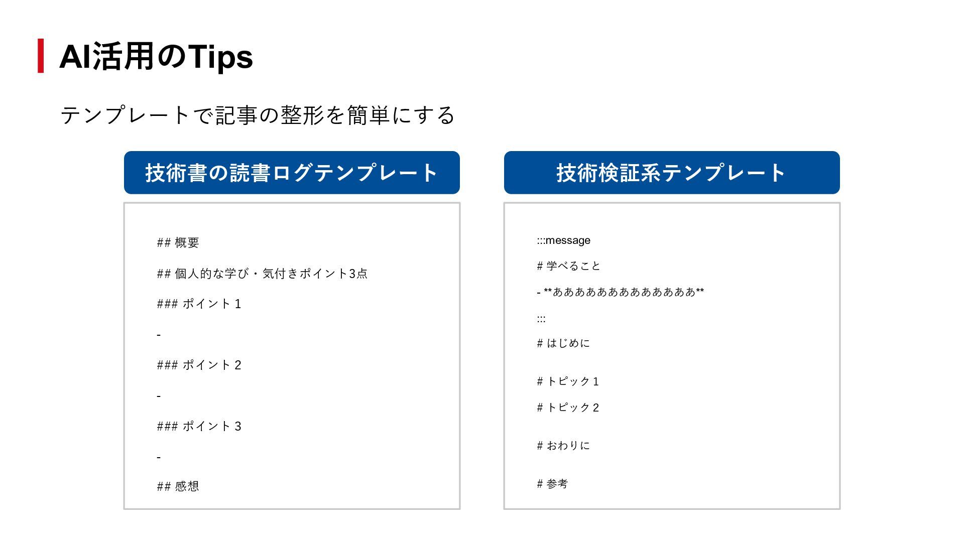 # トピック2 # おわりに # 参考 AI活⽤のTips ## 概要 ## 個⼈的な学び・気付きポイント3点 ### ポイント1 - ### ポイント2 - ### ポイント3 - ## 感想 技術書の読書ログテンプレート 技術検証系テンプレート テンプレートで記事の整形を簡単にする