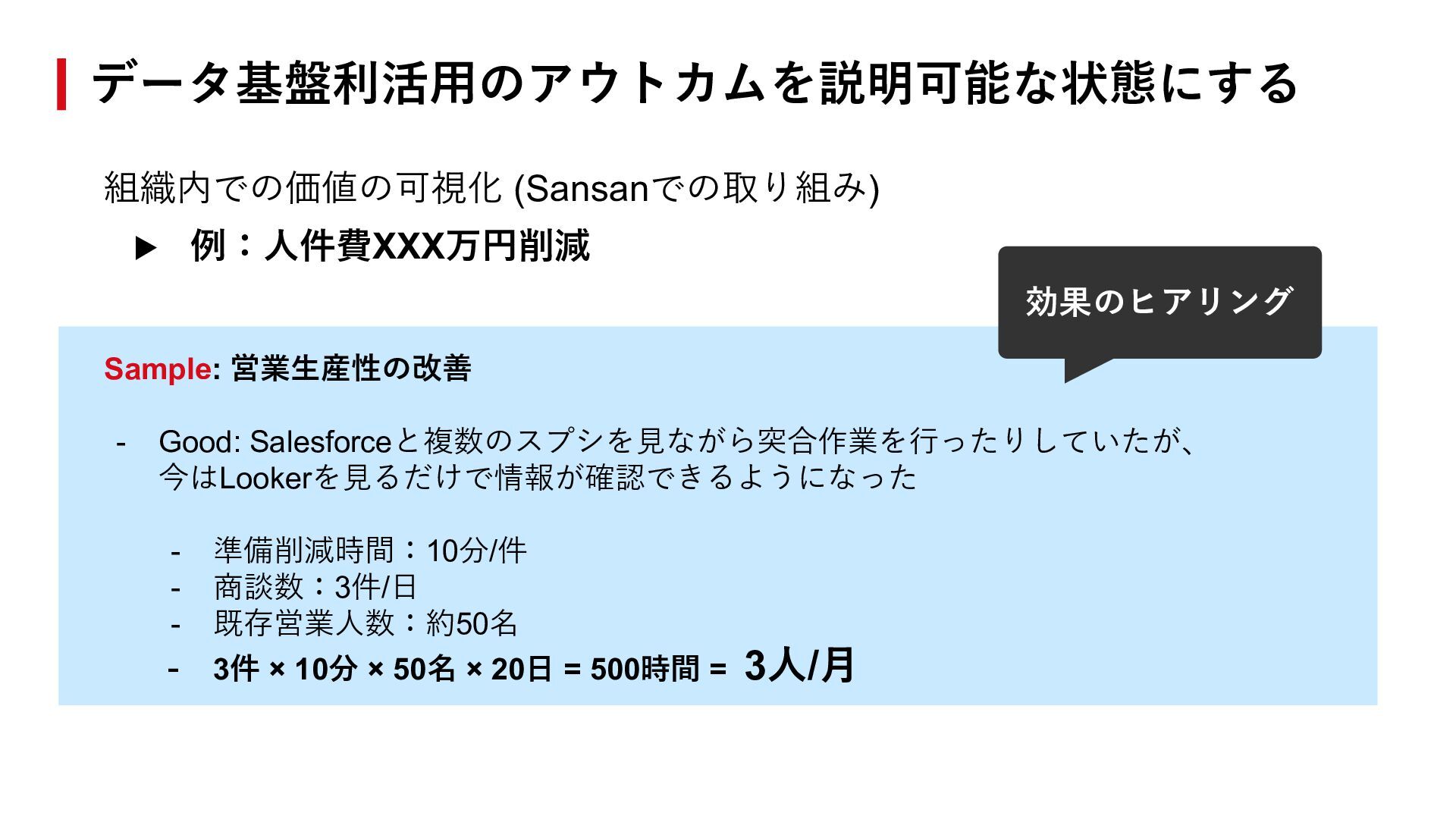 今はLookerを⾒るだけで情報が確認できるようになった - 準備削減時間:10分/件 - 商談数:3件/⽇ - 既存営業⼈数:約50名 - 3件 × 10分 × 50名 × 20⽇ = 500時間 = 3⼈/⽉ 効果のヒアリング