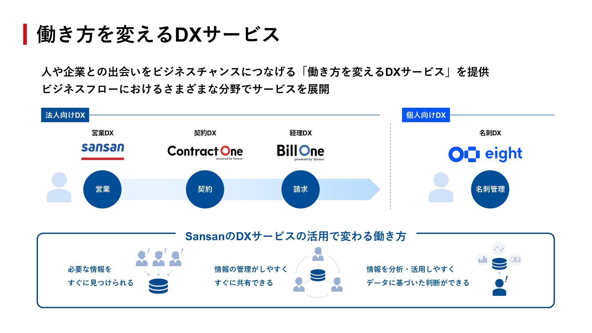 個⼈向けDX 法⼈向けDX 必要な情報を すぐに⾒つけられる 情報の管理がしやすく すぐに共有できる 情報を分析・活⽤しやすく データに基づいた判断ができる SansanのDXサービスの活⽤で変わる働き⽅ 働き⽅を変えるDXサービス