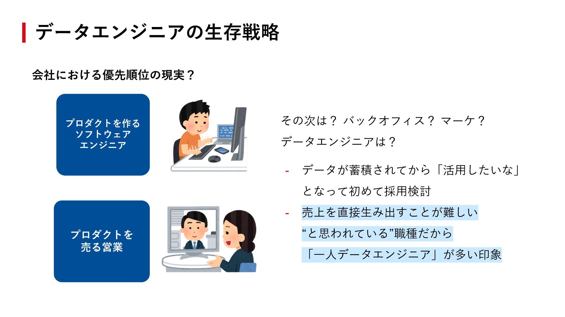 データエンジニアは? - データが蓄積されてから「活⽤したいな」 となって初めて採⽤検討 - 売上を直接⽣み出すことが難しい “と思われている”職種だから 「⼀⼈データエンジニア」が多い印象