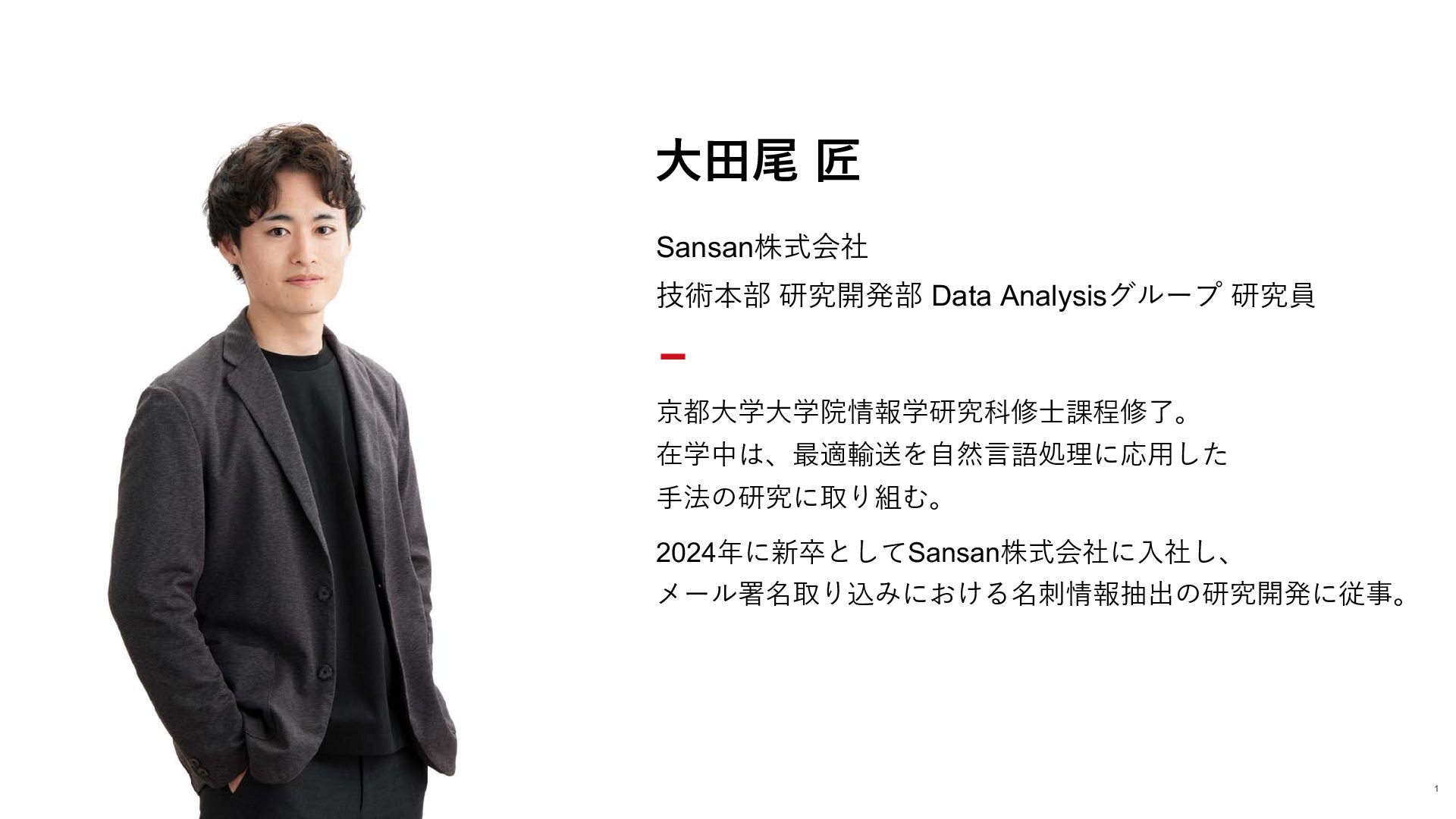 1. ⼤⽥尾 匠 Sansan株式会社 技術本部 研究開発部 Data Analysisグループ 研究員 京都⼤学⼤学院情報学研究科修⼠課程修了。 在学中は、最適輸送を⾃然⾔語処理に応⽤した