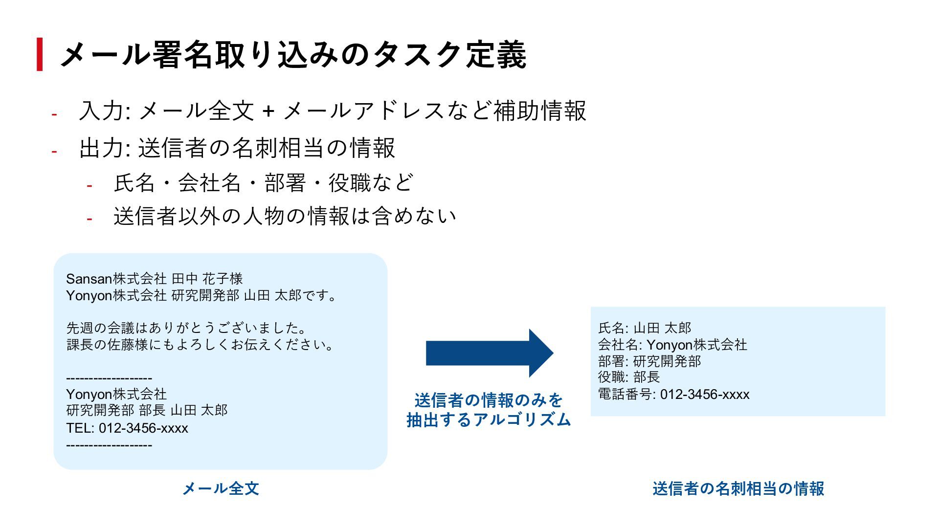 - 送信者以外の⼈物の情報は含めない メール署名取り込みのタスク定義 ⽒名: ⼭⽥ 太郎 会社名: Yonyon株式会社 部署: 研究開発部 役職: 部⻑ 電話番号: 012-3456-xxxx メール全⽂ 送信者の名刺相当の情報 Sansan株式会社 ⽥中 花⼦様 Yonyon株式会社 研究開発部 ⼭⽥ 太郎です。 先週の会議はありがとうございました。 課⻑の佐藤様にもよろしくお伝えください。 ------------------- Yonyon株式会社 研究開発部 部⻑ ⼭⽥ 太郎 TEL: 012-3456-xxxx ------------------- 送信者の情報のみを 抽出するアルゴリズム
