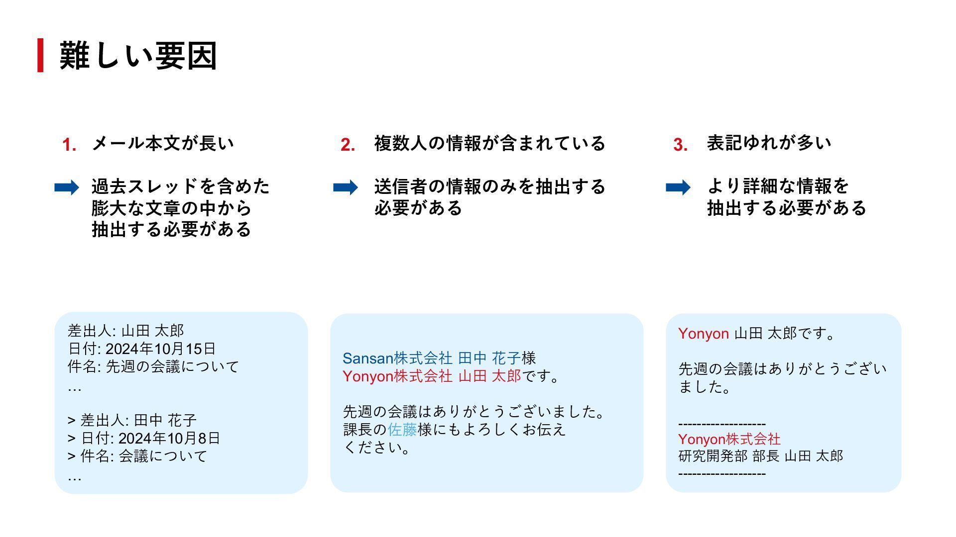 抽出する必要がある 差出⼈: ⼭⽥ 太郎 ⽇付: 2024年10⽉15⽇ 件名: 先週の会議について … > 差出⼈: ⽥中 花⼦ > ⽇付: 2024年10⽉8⽇ > 件名: 会議について … Sansan株式会社 ⽥中 花⼦様 Yonyon株式会社 ⼭⽥ 太郎です。 先週の会議はありがとうございました。 課⻑の佐藤様にもよろしくお伝え ください。 Yonyon ⼭⽥ 太郎です。 先週の会議はありがとうござい ました。 ------------------- Yonyon株式会社 研究開発部 部⻑ ⼭⽥ 太郎 ------------------- 1. 2. 3.