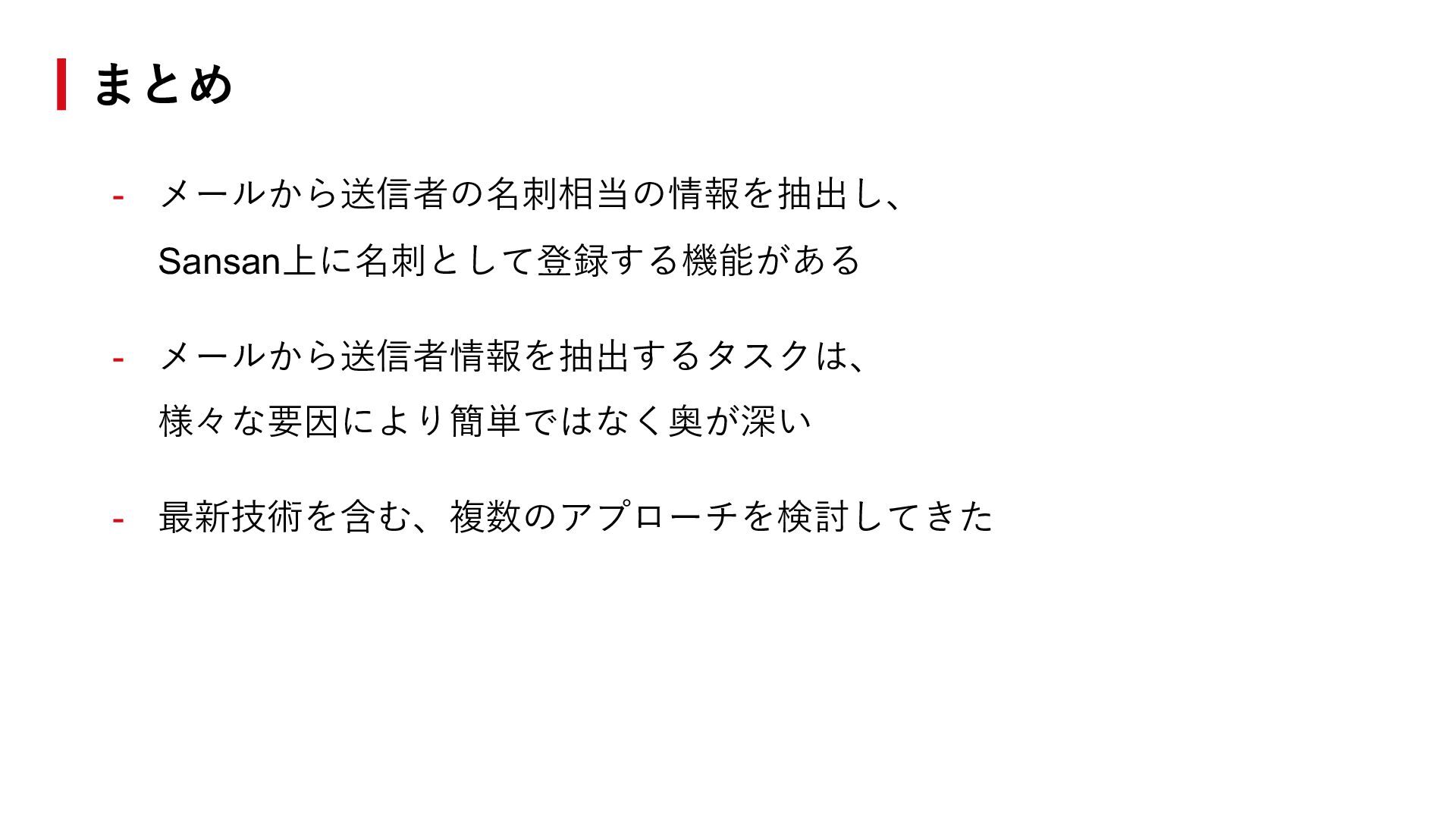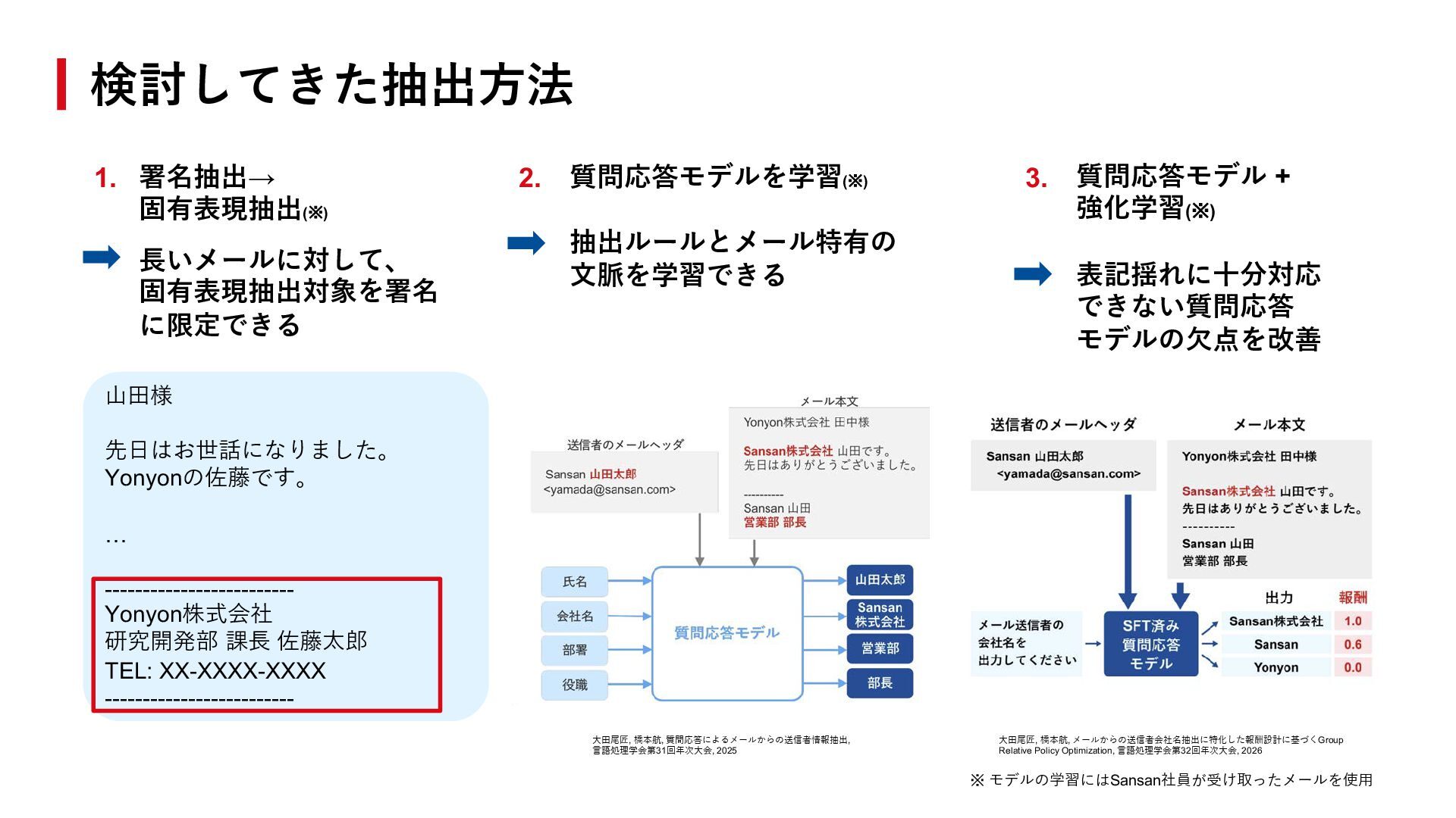 TEL: XX-XXXX-XXXX ------------------------- ※ モデルの学習にはSansan社員が受け取ったメールを使⽤ ⼤⽥尾匠, 橋本航, 質問応答によるメールからの送信者情報抽出, ⾔語処理学会第31回年次⼤会, 2025 ⼤⽥尾匠, 橋本航, メールからの送信者会社名抽出に特化した報酬設計に基づくGroup Relative Policy Optimization, ⾔語処理学会第32回年次⼤会, 2026 署名抽出→ 固有表現抽出(※) ⻑いメールに対して、 固有表現抽出対象を署名 に限定できる 質問応答モデルを学習(※) 抽出ルールとメール特有の ⽂脈を学習できる 質問応答モデル + 強化学習(※) 表記揺れに⼗分対応 できない質問応答 モデルの⽋点を改善 1. 2. 3.