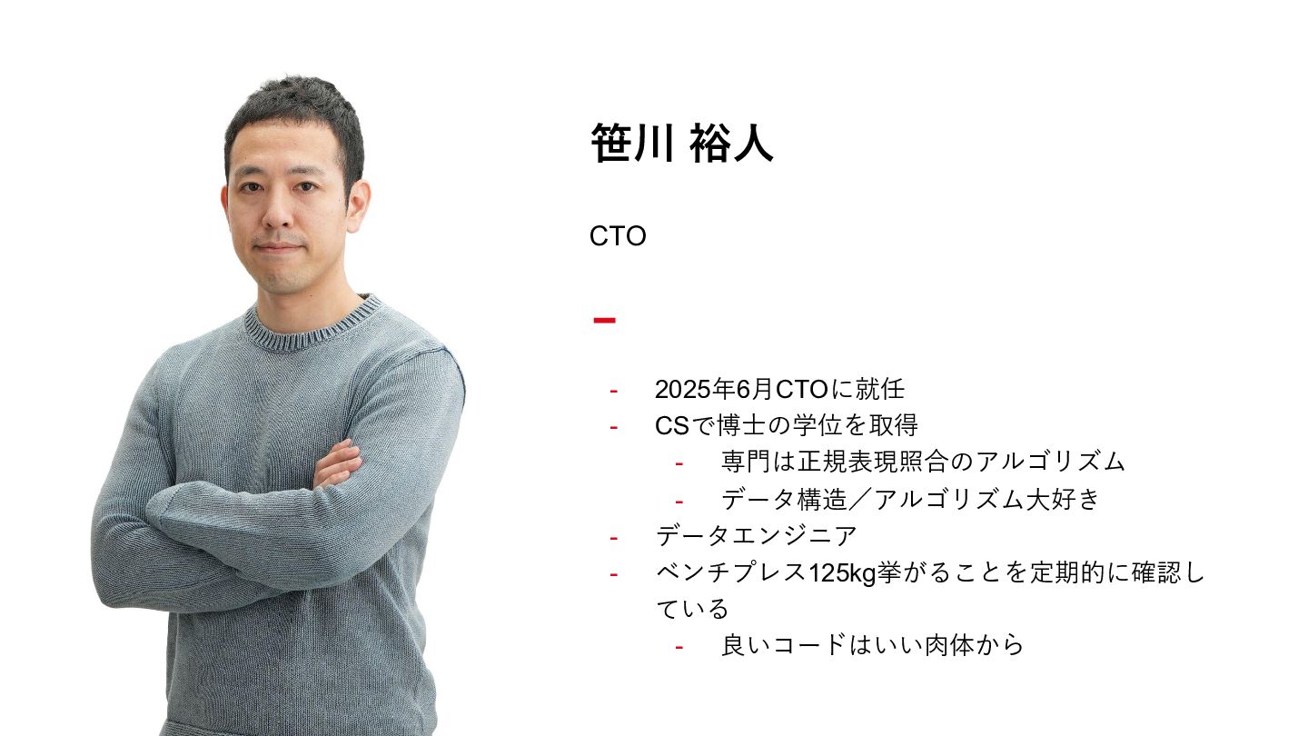 1. 写真が入ります 笹川 裕⼈ - 2025年6⽉CTOに就任 - CSで博⼠の学位を取得 - 専⾨は正規表現照合のアルゴリズム -