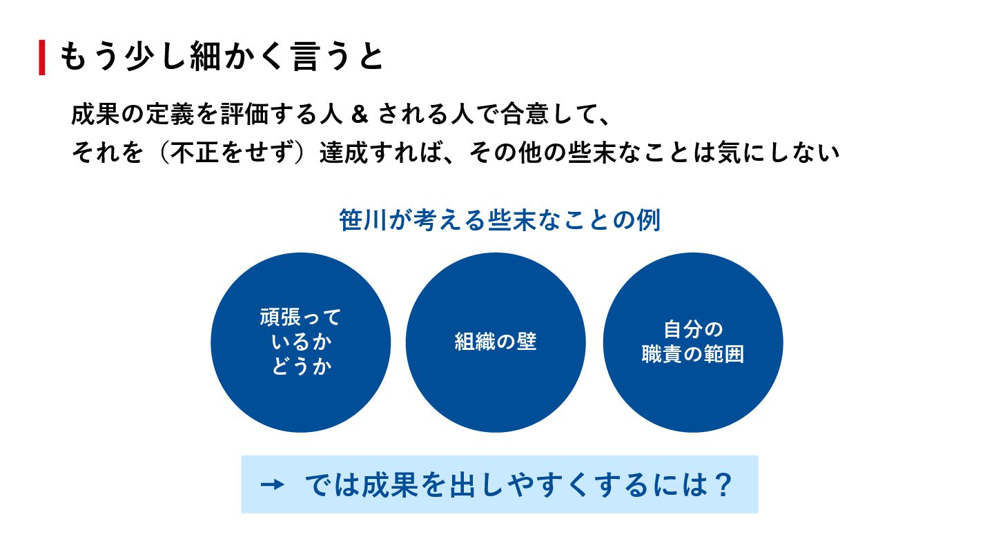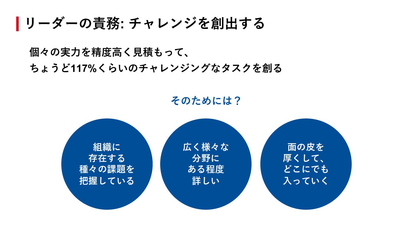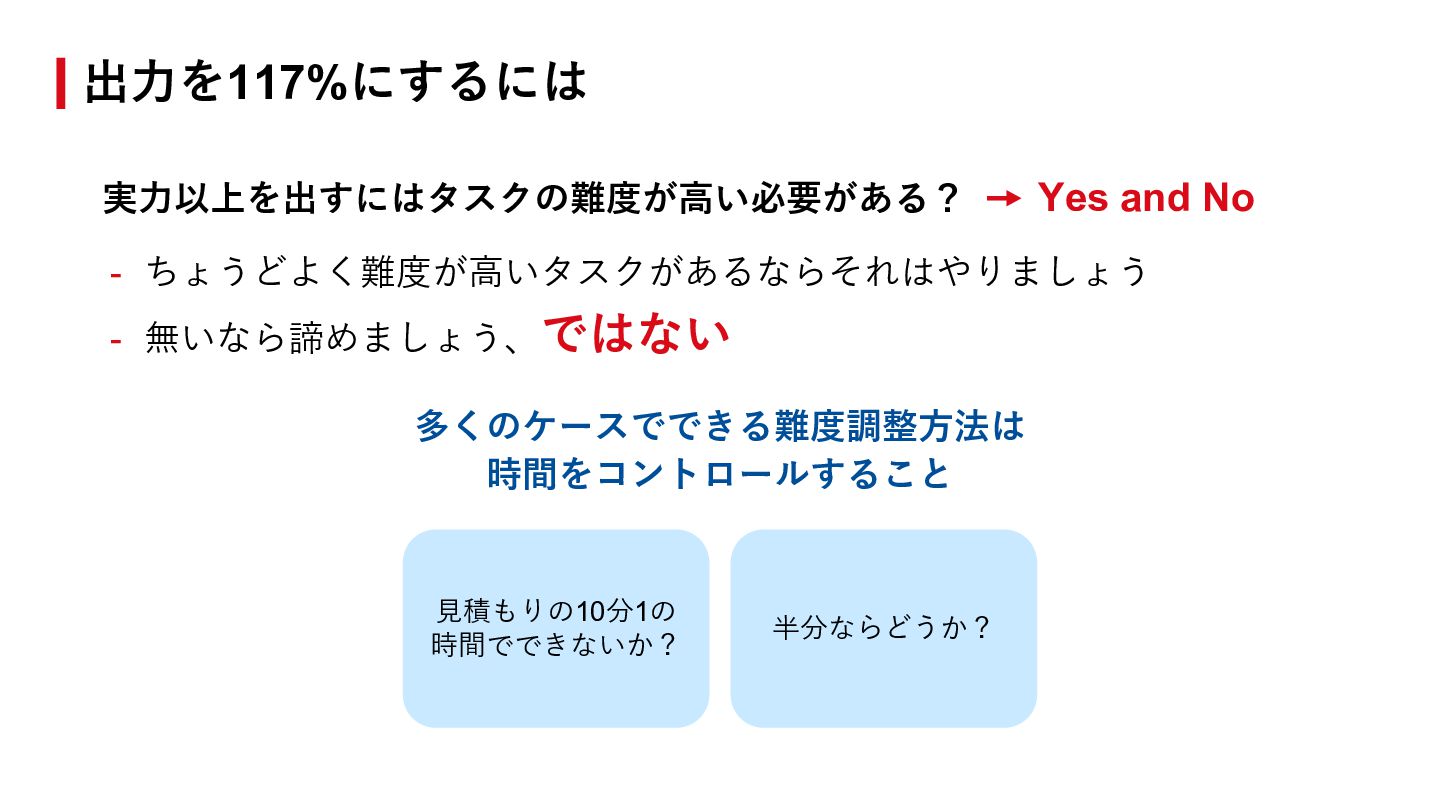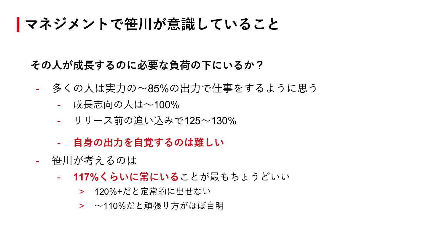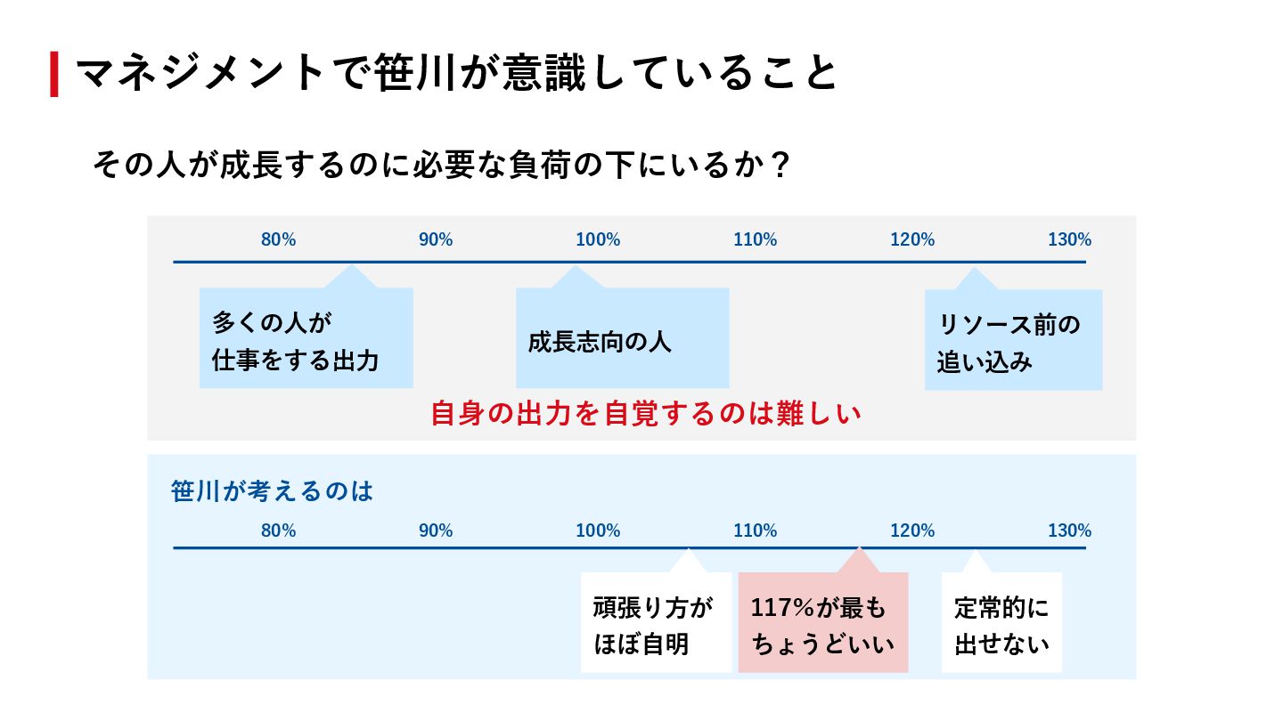 笹川が考えるのは - 117%くらいに常にいることが最もちょうどいい > 120%+だと定常的に出せない > 〜110%だと頑張り⽅がほぼ⾃明 マネジメントで笹川が意識していること