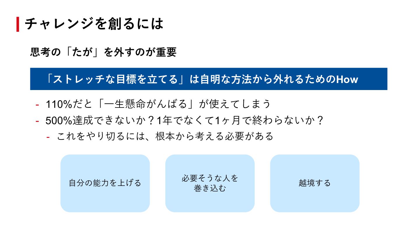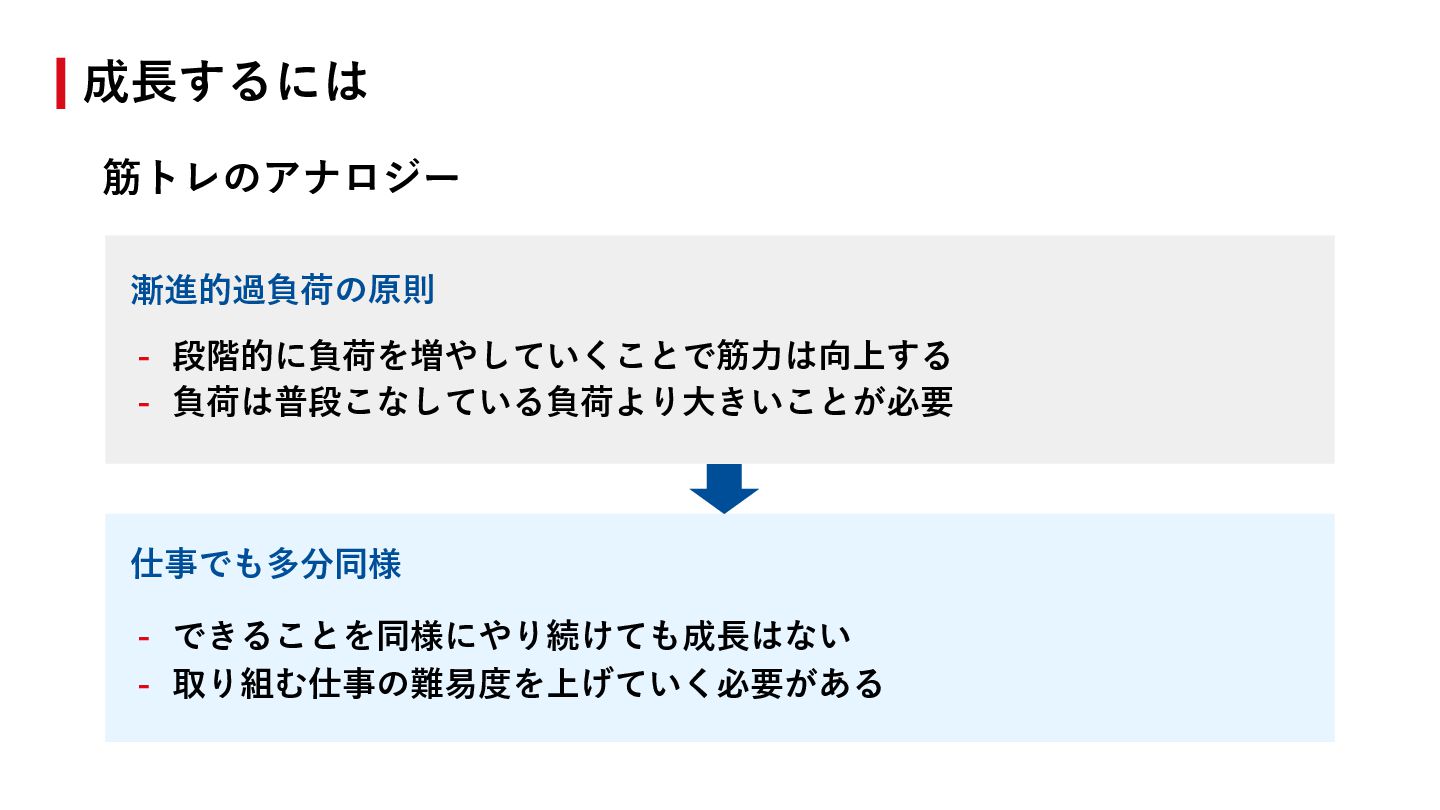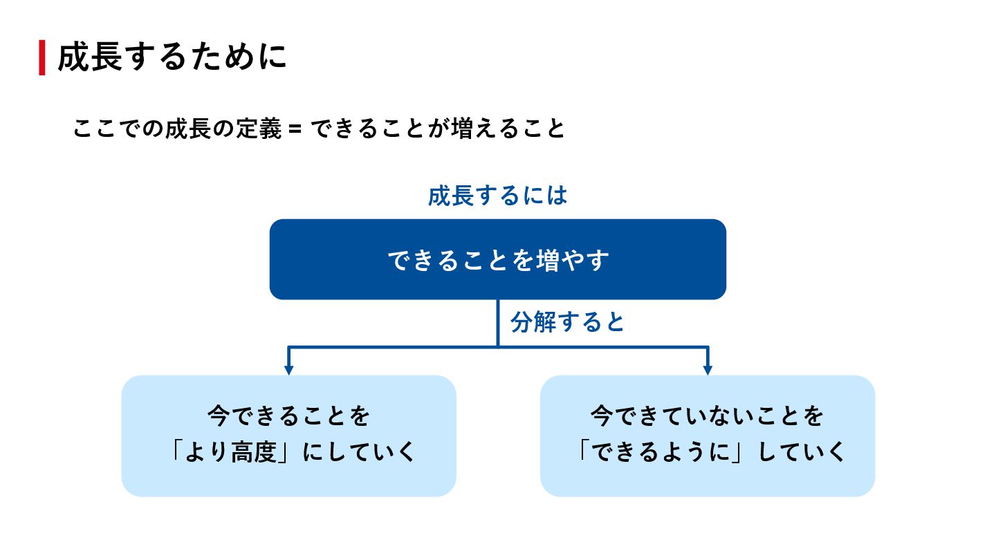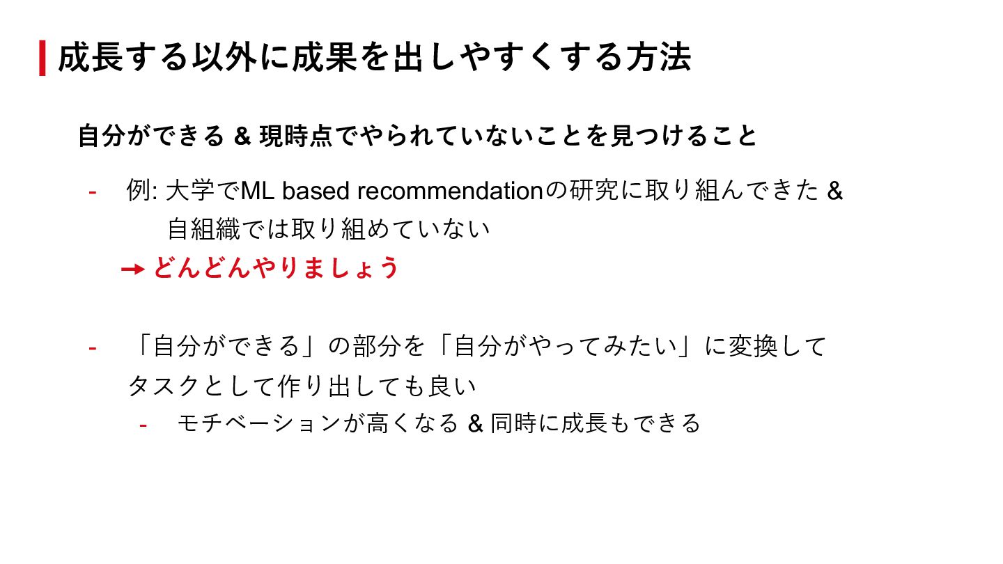 どんどんやりましょう - 「⾃分ができる」の部分を「⾃分がやってみたい」に変換して タスクとして作り出しても良い - モチベーションが⾼くなる & 同時に成⻑もできる 成⻑する以外に成果を出しやすくする⽅法