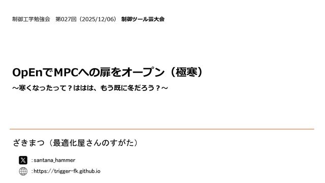 OpEnでMPCへの扉をオープン(極寒) ~寒くなったって?ははは、もう既に冬だろう?~ ざきまつ(最適化屋さんのすがた) 制御工学勉強会 第027回(2025/12/06) 制御ツール芸大会 :santana_hammer :https://trigger-fk.github.io