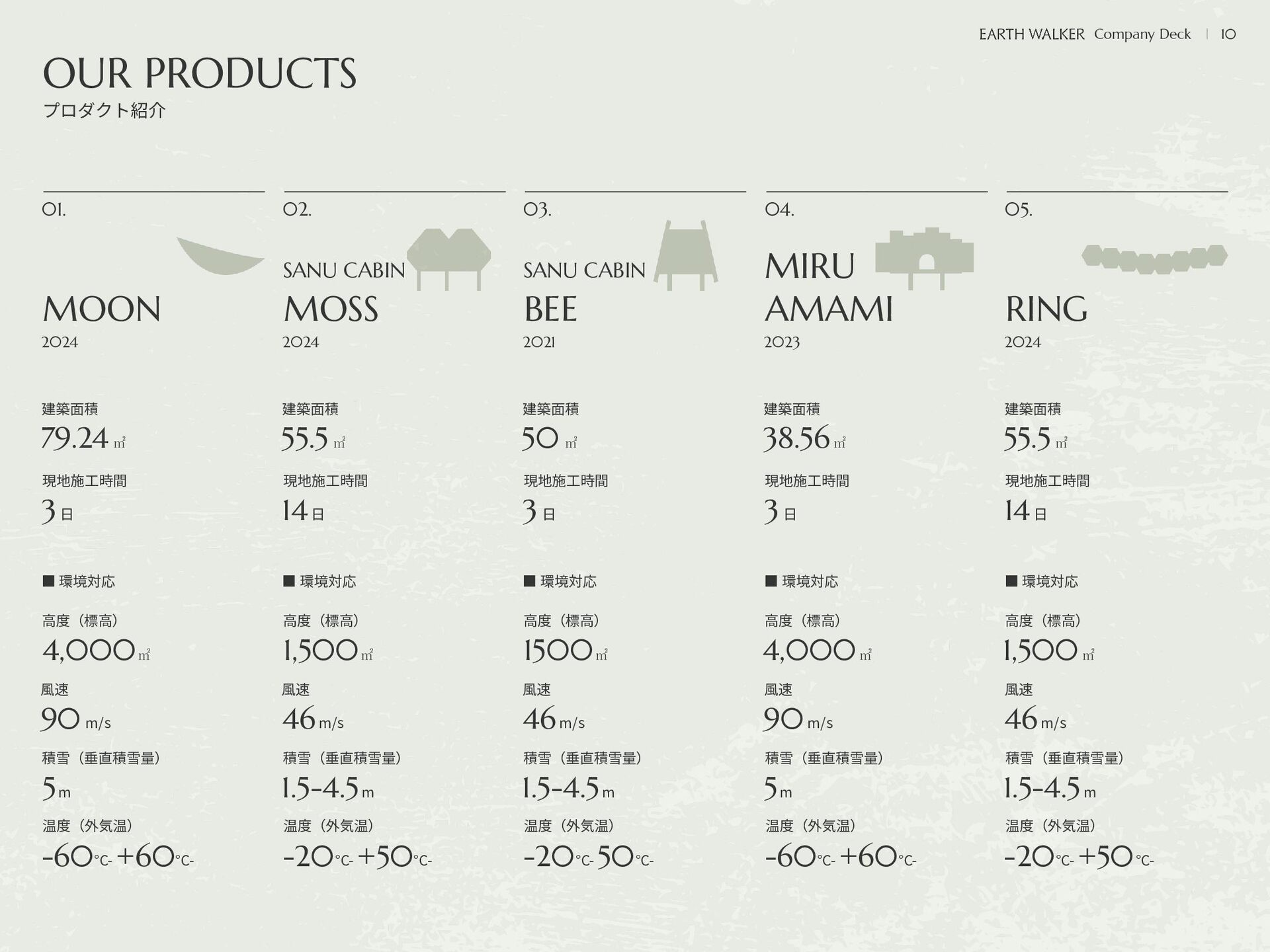 79.24㎡ 現地施⼯時間 ⽇ 3 ▪ 環境対応 ㎡ 4,000 ⾼度(標⾼) m/s 90 ⾵速 m 5 積雪(垂直積雪量) °C- 温度(外気温) -60 °C- +60 02. MOSS 2024 建築⾯積 55.5㎡ 現地施⼯時間 ⽇ ▪ 環境対応 ㎡ 1,500 ⾼度(標⾼) m/s 46 ⾵速 m 1.5-4.5 積雪(垂直積雪量) °C- 温度(外気温) -20 °C- +50 SANU CABIN 14 03. BEE 2021 建築⾯積 50 ㎡ 現地施⼯時間 ⽇ ▪ 環境対応 ㎡ 1500 ⾼度(標⾼) m/s 46 ⾵速 m 1.5-4.5 積雪(垂直積雪量) °C- 温度(外気温) -20 °C- 50 SANU CABIN 3 04. AMAMI 2023 建築⾯積 38.56㎡ 現地施⼯時間 ⽇ ▪ 環境対応 ㎡ 4,000 ⾼度(標⾼) m/s 90 ⾵速 m 5 積雪(垂直積雪量) °C- 温度(外気温) -60 °C- +60 MIRU 3 05. RING 2024 建築⾯積 55.5㎡ 現地施⼯時間 ⽇ ▪ 環境対応 ㎡ 1,500 ⾼度(標⾼) m/s 46 ⾵速 m 積雪(垂直積雪量) °C- 温度(外気温) -20 °C- +50 14 1.5-4.5