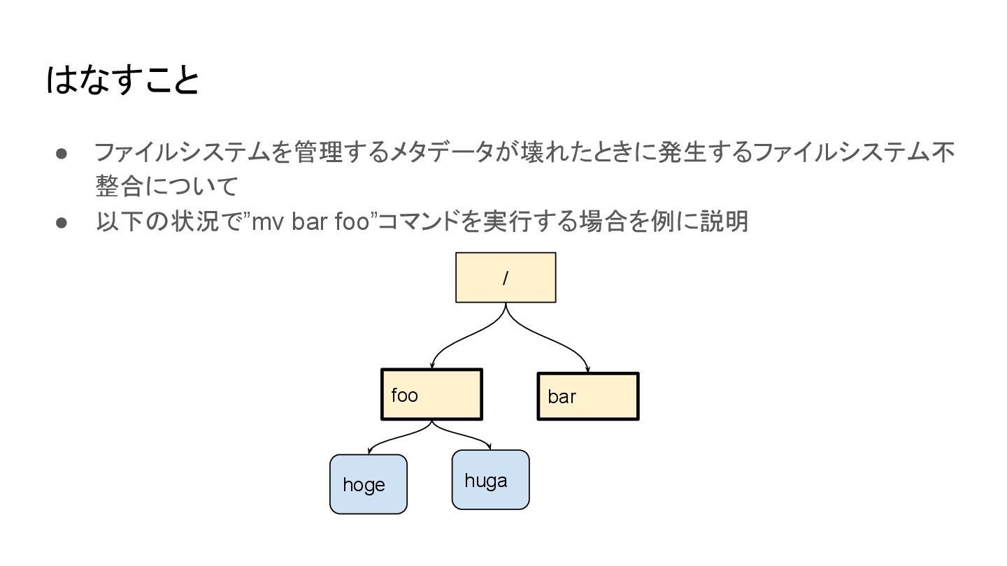 はなすこと • ファイルシステムを管理するメタデータが壊れたときに発生するファイルシステム不 整合について • 以下の状況で”mv bar foo”コマンドを実行する場合を例に説明 / foo
