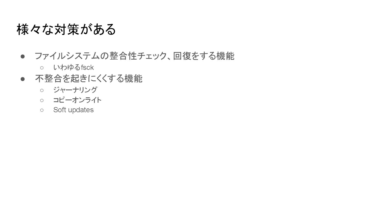 様々な対策がある • ファイルシステムの整合性チェック、回復をする機能 ◦ いわゆるfsck • 不整合を起きにくくする機能 ◦ ジャーナリング ◦