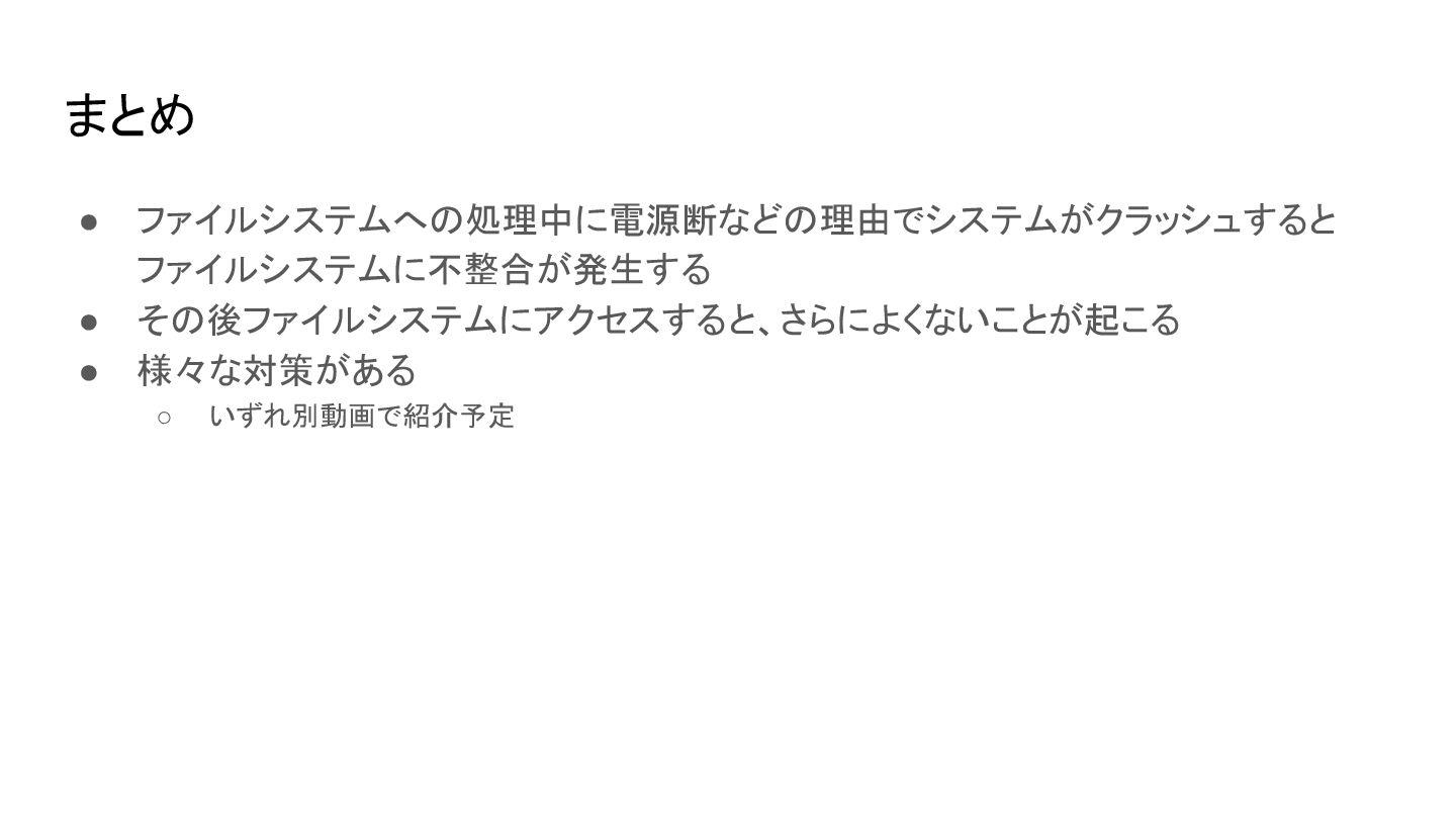 まとめ • ファイルシステムへの処理中に電源断などの理由でシステムがクラッシュすると ファイルシステムに不整合が発生する • その後ファイルシステムにアクセスすると、さらによくないことが起こる • 様々な対策がある ◦ いずれ別動画で紹介予定