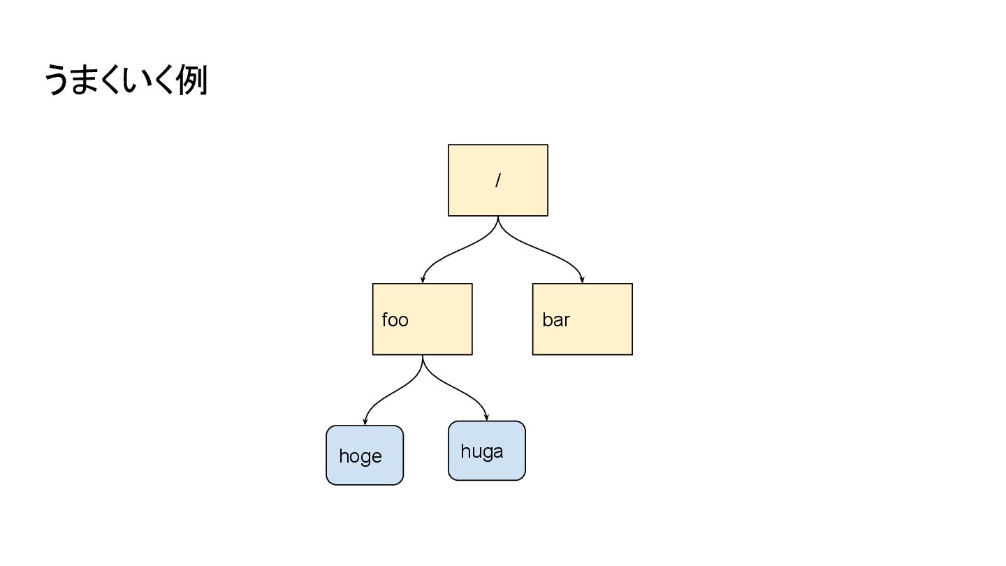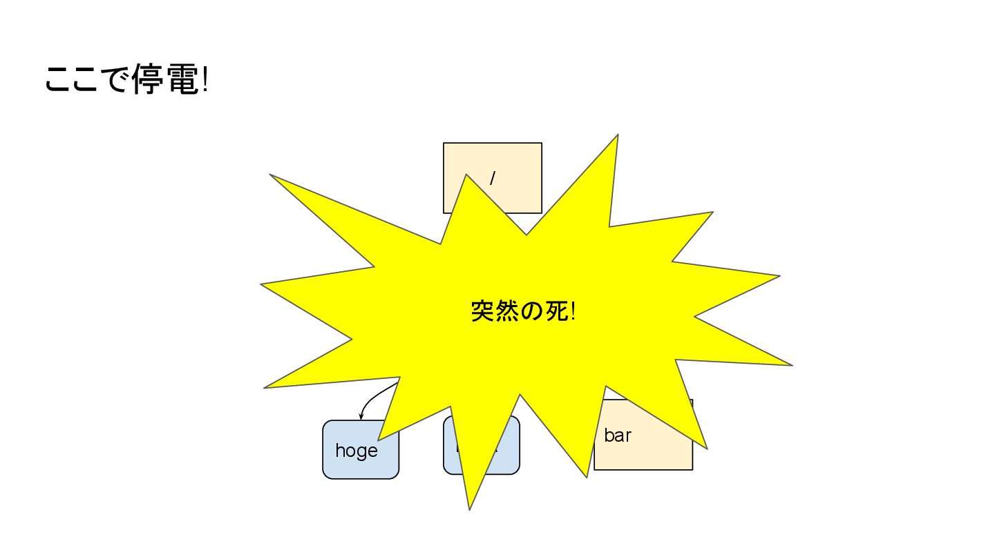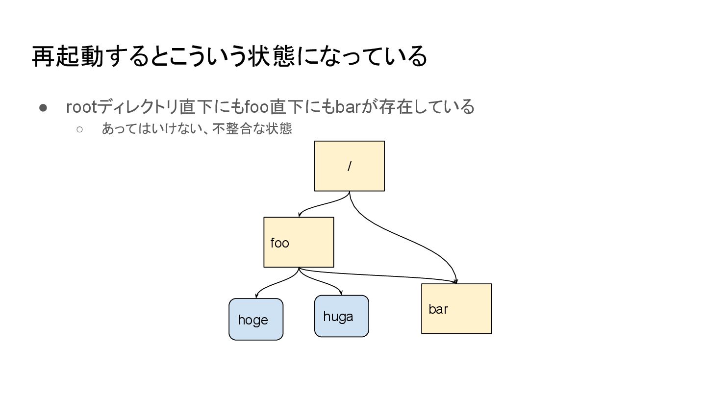 再起動するとこういう状態になっている • rootディレクトリ直下にもfoo直下にもbarが存在している ◦ あってはいけない、不整合な状態 / foo bar huga hoge