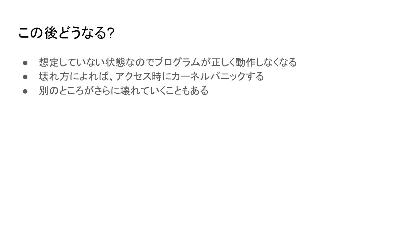 この後どうなる? • 想定していない状態なのでプログラムが正しく動作しなくなる • 壊れ方によれば、アクセス時にカーネルパニックする • 別のところがさらに壊れていくこともある