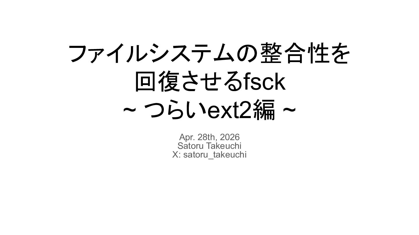 ファイルシステムの整合性を 回復させるfsck ~ つらいext2編 ~ Apr. 28th, 2026 Satoru Takeuchi