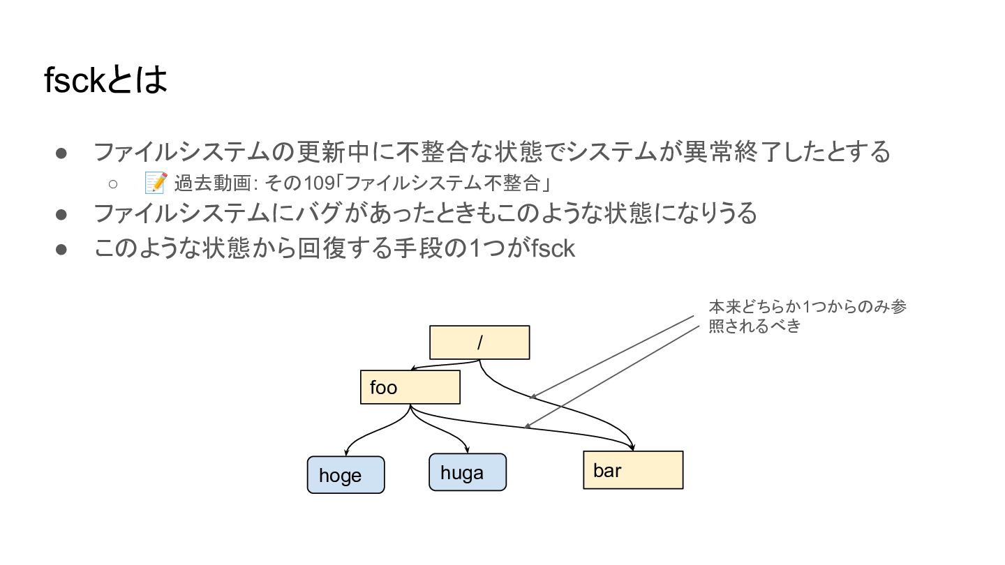 • ファイルシステムの更新中に不整合な状態でシステムが異常終了したとする ◦ 📝 過去動画: その109「ファイルシステム不整合」 • ファイルシステムにバグがあったときもこのような状態になりうる • このような状態から回復する手段の1つがfsck