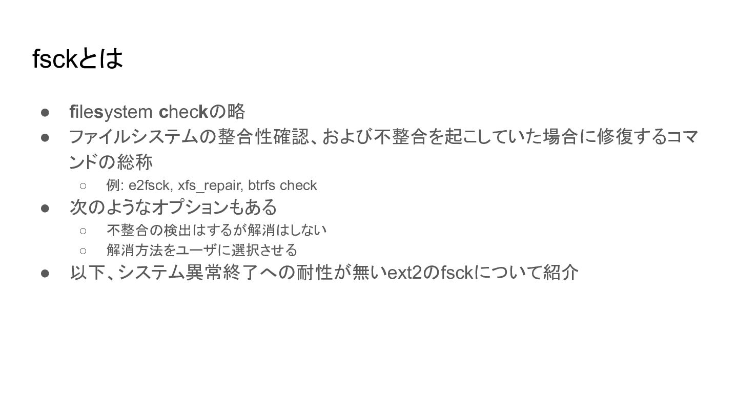 fsckとは • filesystem checkの略 • ファイルシステムの整合性確認、および不整合を起こしていた場合に修復するコマ ンドの総称 ◦ 例: e2fsck,