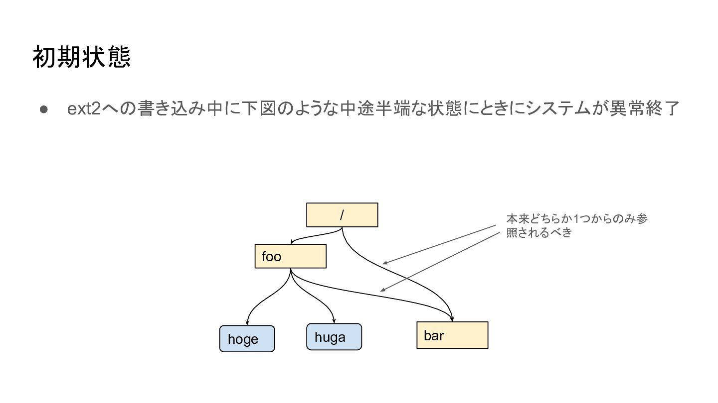 初期状態 • ext2への書き込み中に下図のような中途半端な状態にときにシステムが異常終了 / foo bar huga hoge 本来どちらか1つからのみ参 照されるべき