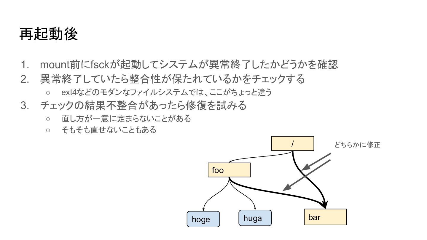 再起動後 1. mount前にfsckが起動してシステムが異常終了したかどうかを確認 2. 異常終了していたら整合性が保たれているかをチェックする ◦ ext4などのモダンなファイルシステムでは、ここがちょっと違う 3. チェックの結果不整合があったら修復を試みる ◦