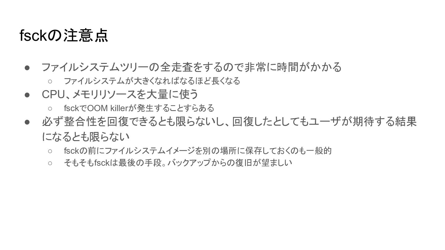 fsckの注意点 • ファイルシステムツリーの全走査をするので非常に時間がかかる ◦ ファイルシステムが大きくなればなるほど長くなる • CPU、メモリリソースを大量に使う ◦ fsckでOOM killerが発生することすらある