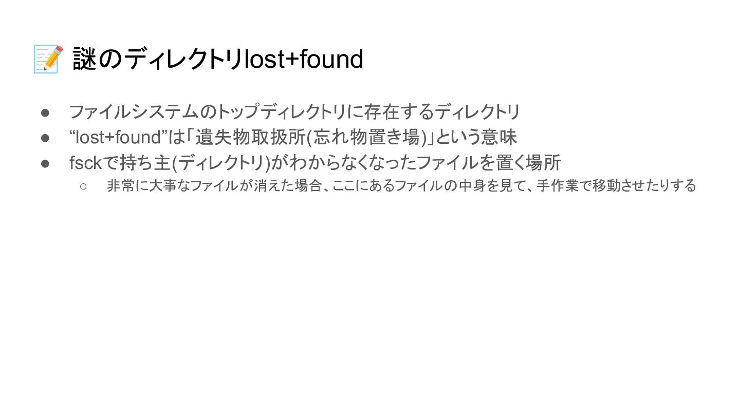 📝 謎のディレクトリlost+found • ファイルシステムのトップディレクトリに存在するディレクトリ • “lost+found”は「遺失物取扱所(忘れ物置き場)」という意味 • fsckで持ち主(ディレクトリ)がわからなくなったファイルを置く場所 ◦ 非常に大事なファイルが消えた場合、ここにあるファイルの中身を見て、手作業で移動させたりする