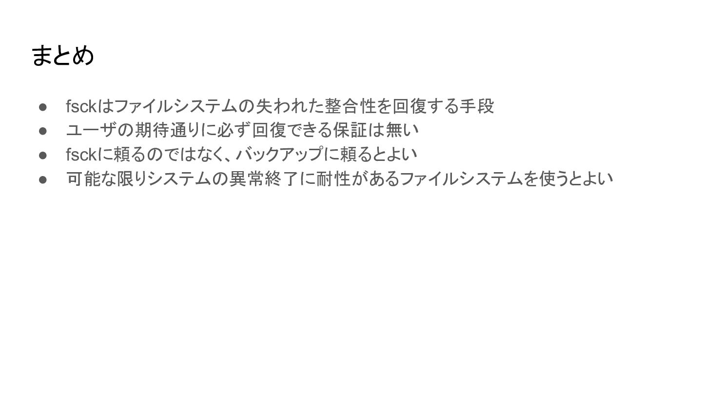• 必ず整合性を回復できるとも限らないし、回復したとしてもユーザが期待する結果 になるとも限らない ◦ fsckの前にファイルシステムイメージを別の場所に保存しておくのも一般的 ◦ そもそもfsckは最後の手段。バックアップからの復旧が望ましい