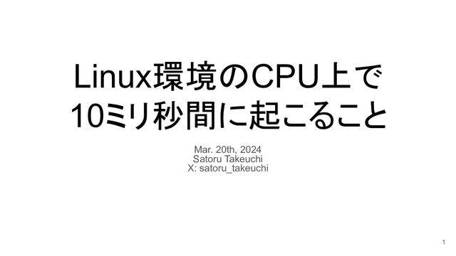 Linux環境のCPU上で 10ミリ秒間に起こること Mar. 20th, 2024 Satoru Takeuchi X: satoru_takeuchi 1