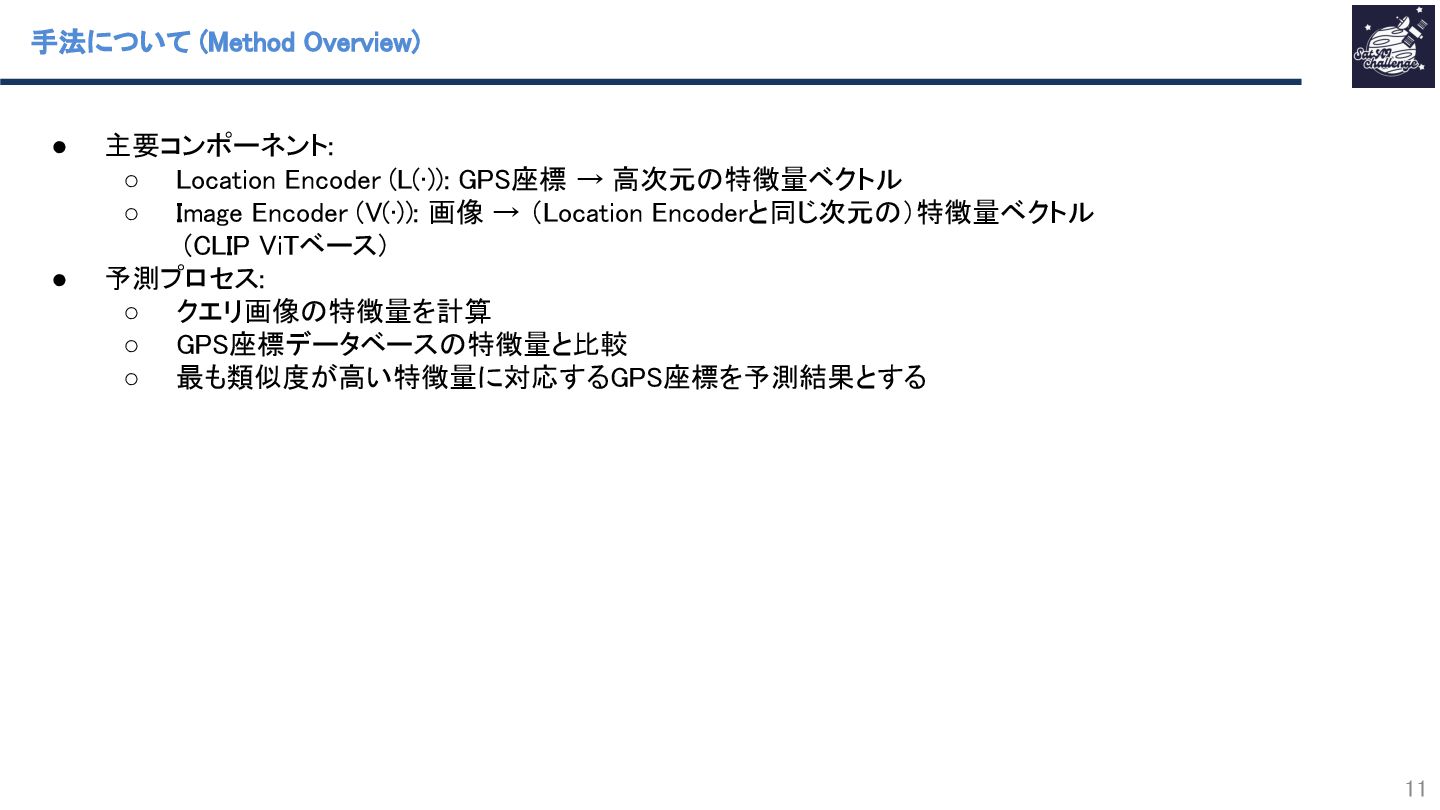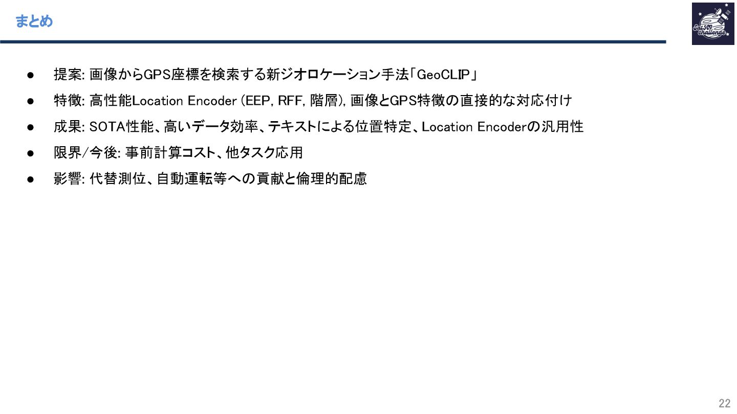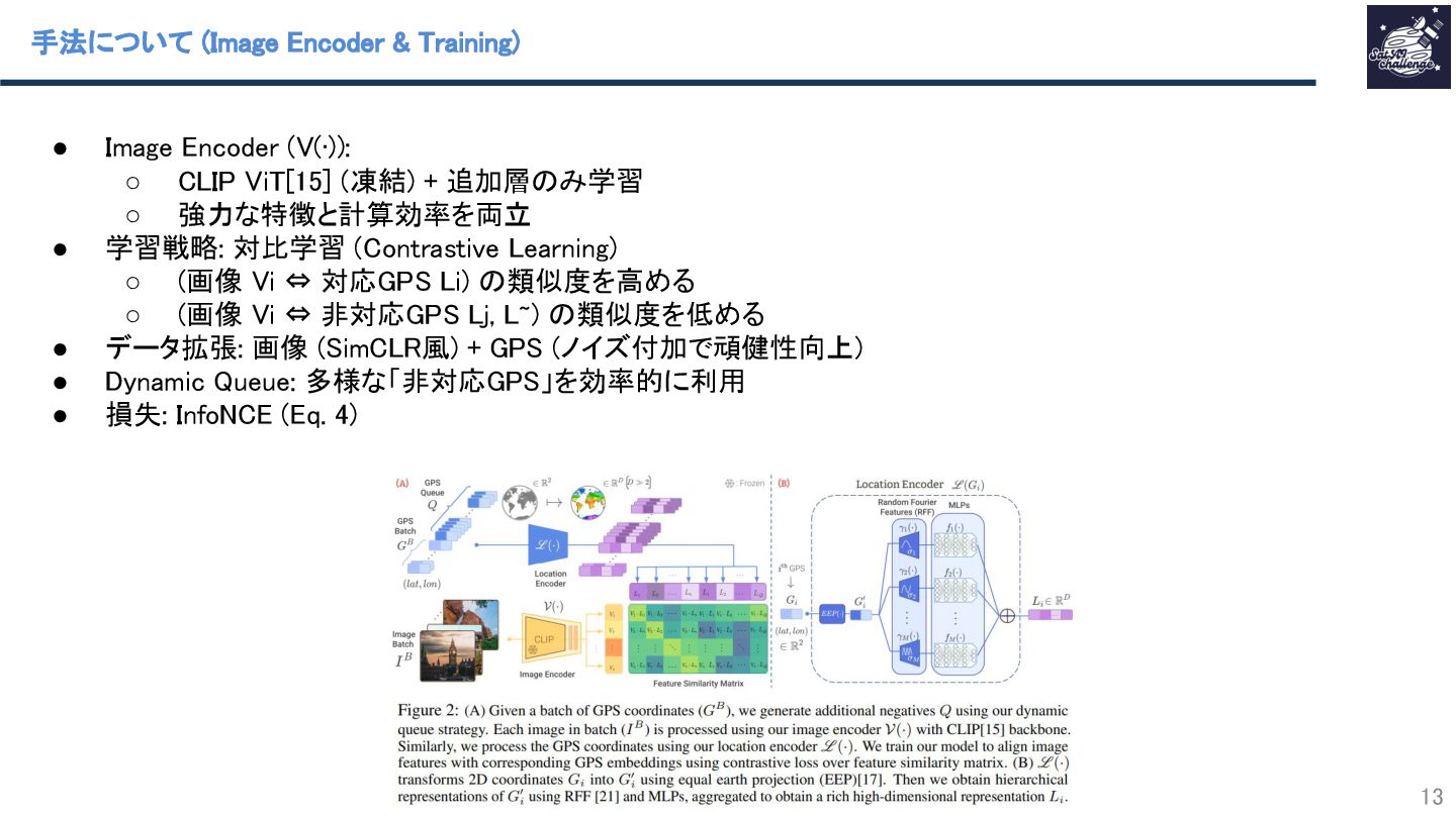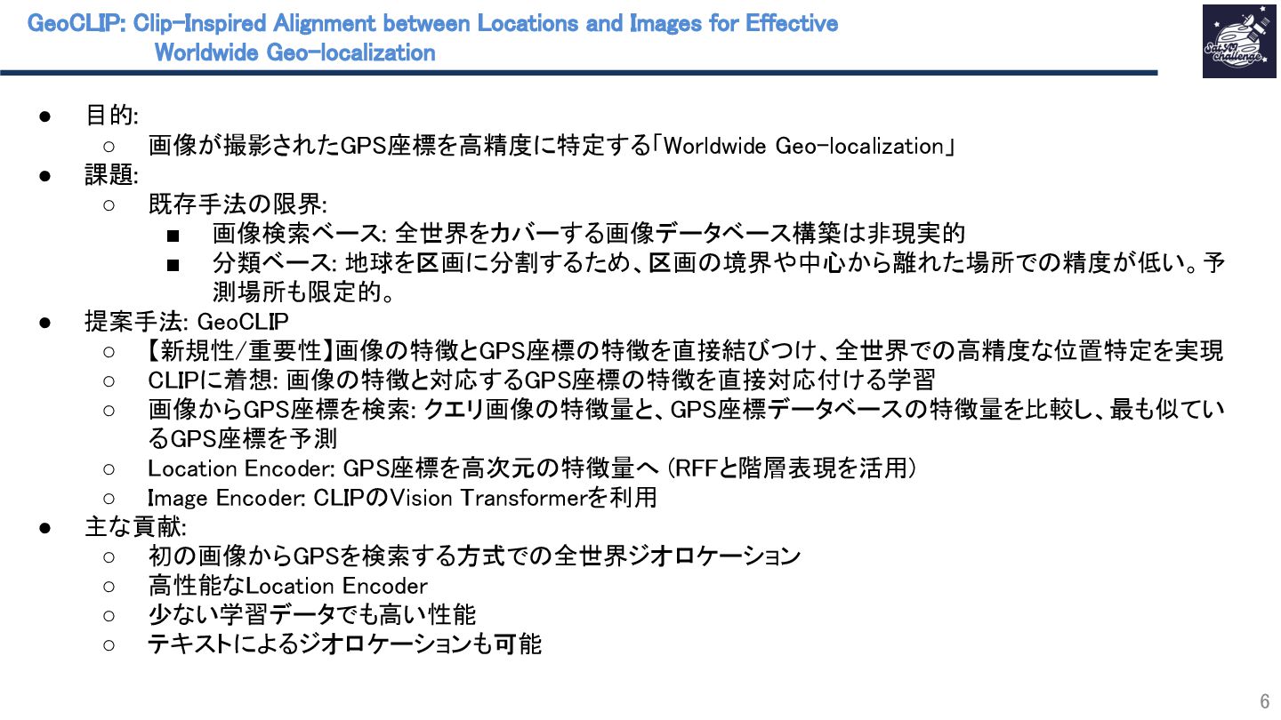紹介する論文は、「GeoCLIP: Clip-Inspired Alignment between Locations and Images for Effective Worldwide Geo-localization」です。 本研究では、全世界のどこで撮影された画像からでもそのGPS座標を特定するタスクにおいて、画像の特徴とGPS座標の特徴を直接結びつけるCLIPに着想を得た検索ベースの手法(GeoCLIP)を提案しています。GeoCLIPによって、少ない訓練データ(全体の20%)でも競争力のある高い精度が得られ、さらに画像だけでなくテキスト情報を用いた地理位置情報の特定も可能になります。