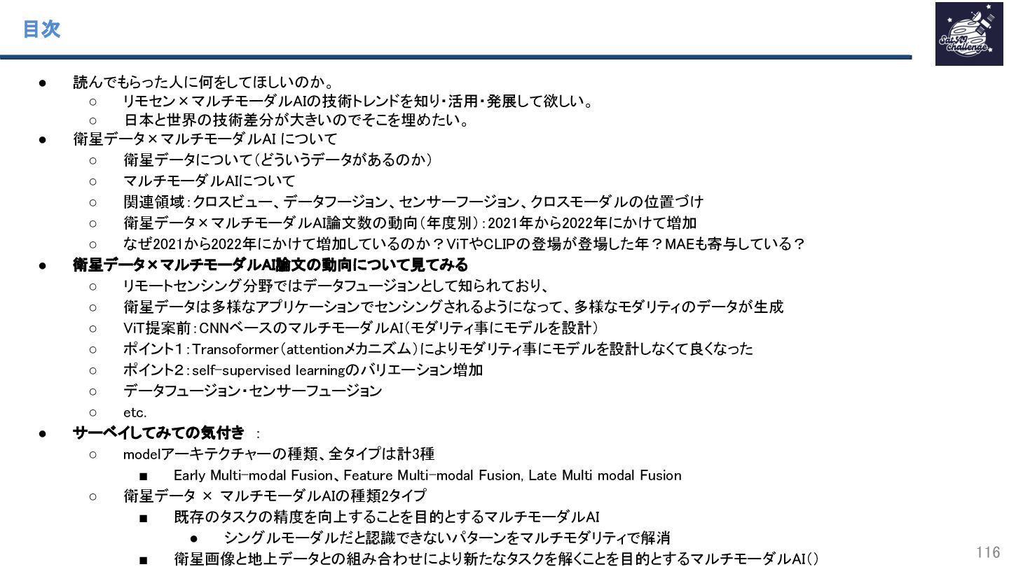 本資料では、Google scholarで閲覧可能なリモートセンシングデータ×マルチモーダルAI論文を集計し、その論文の概念を整理し、今後の展望について触れた資料です。