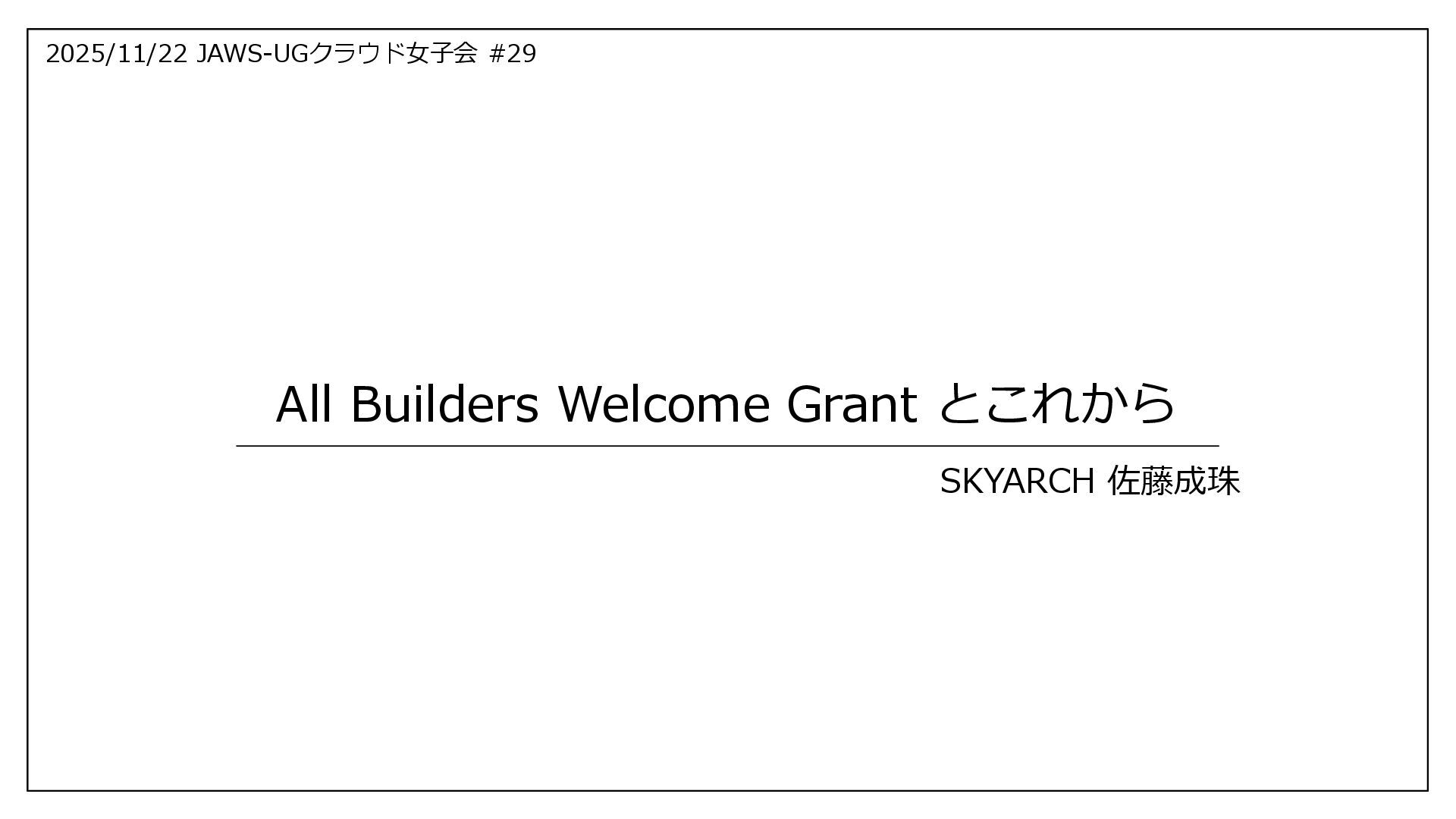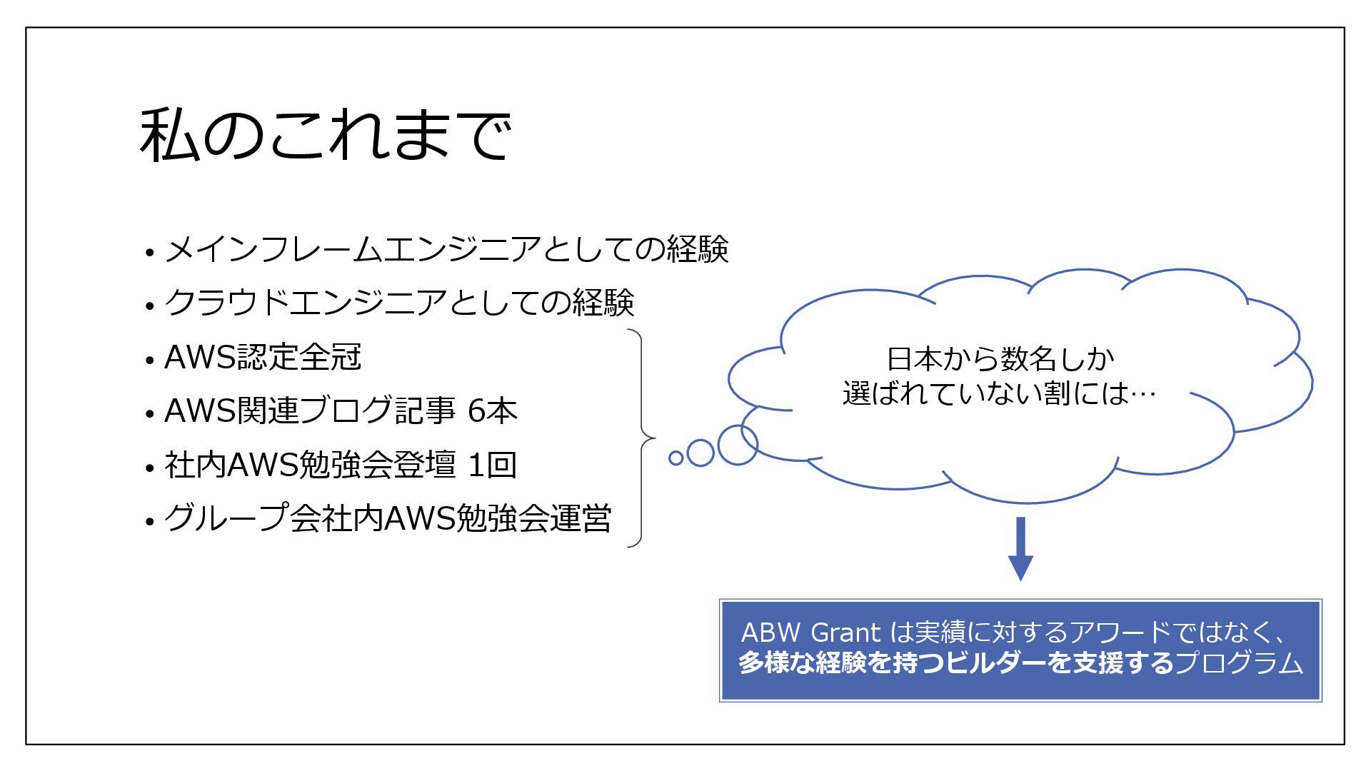 • 社内AWS勉強会登壇 1回 • グループ会社内AWS勉強会運営 日本から数名しか 選ばれていない割には… ABW Grant は実績に対するアワードではなく、 多様な経験を持つビルダーを支援するプログラム