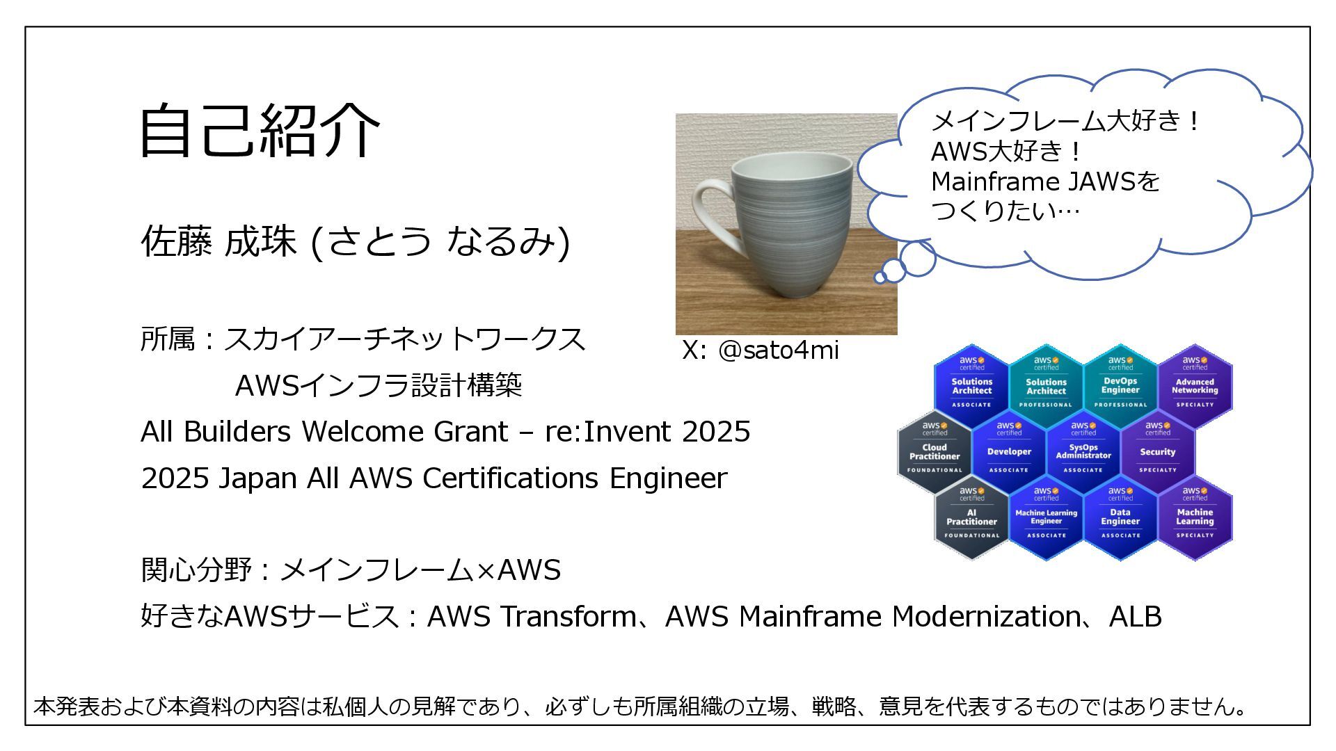 Grant – re:Invent 2025 2025 Japan All AWS Certifications Engineer 関心分野:メインフレーム×AWS 好きなAWSサービス:AWS Transform、AWS Mainframe Modernization、ALB X: @sato4mi 本発表および本資料の内容は私個人の見解であり、必ずしも所属組織の立場、戦略、意見を代表するものではありません。 メインフレーム大好き! AWS大好き! Mainframe JAWSを つくりたい…