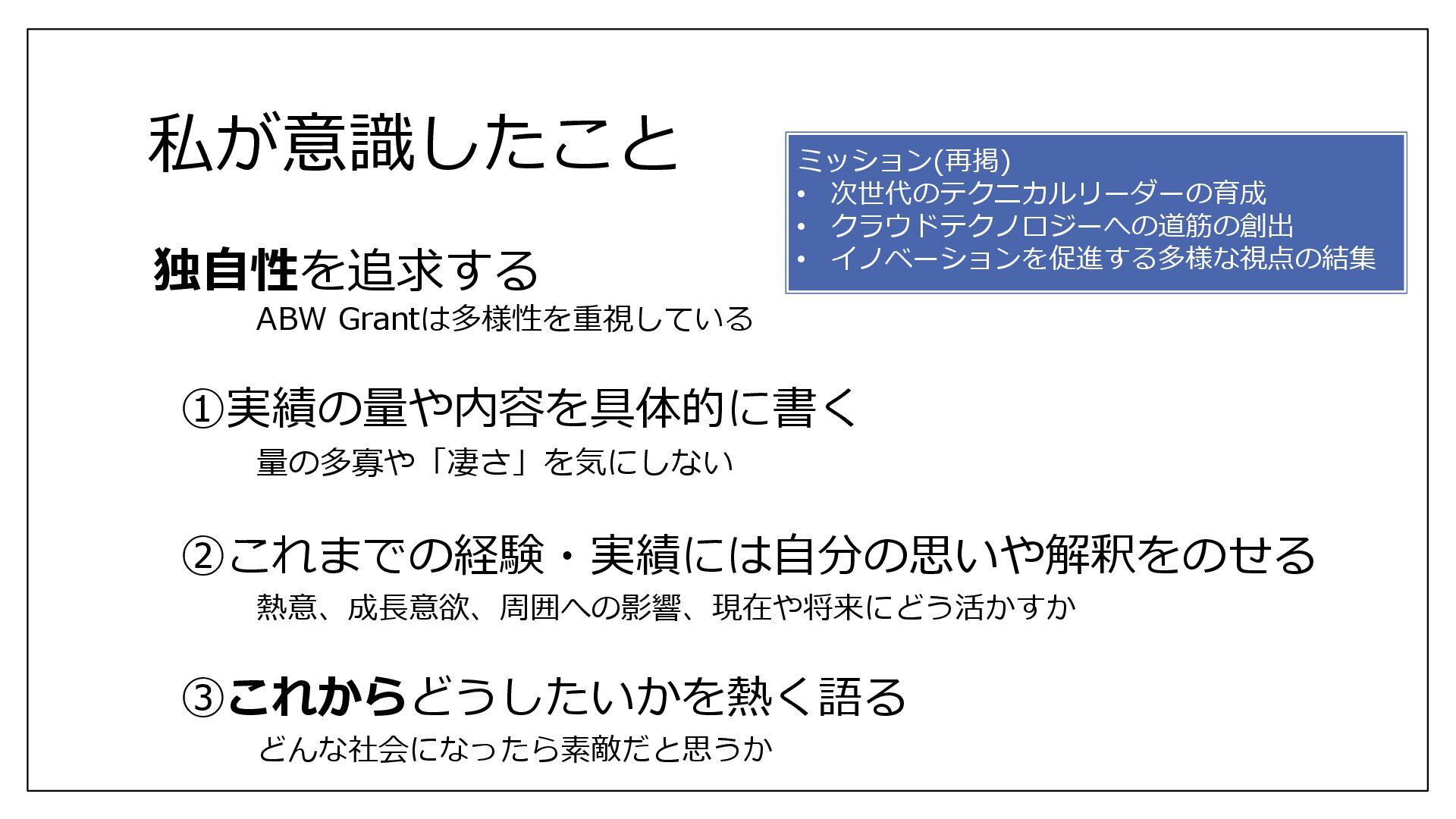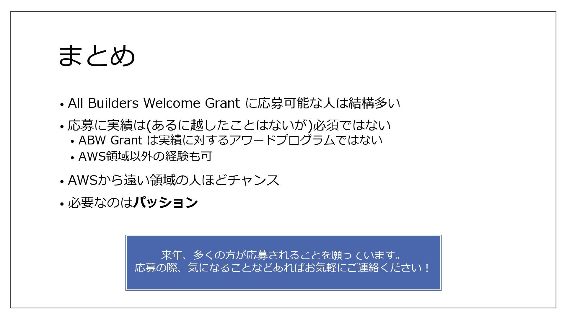 ABW Grant は実績に対するアワードプログラムではない • AWS領域以外の経験も可 • AWSから遠い領域の人ほどチャンス • 必要なのはパッション 来年、多くの方が応募されることを願っています。 応募の際、気になることなどあればお気軽にご連絡ください!