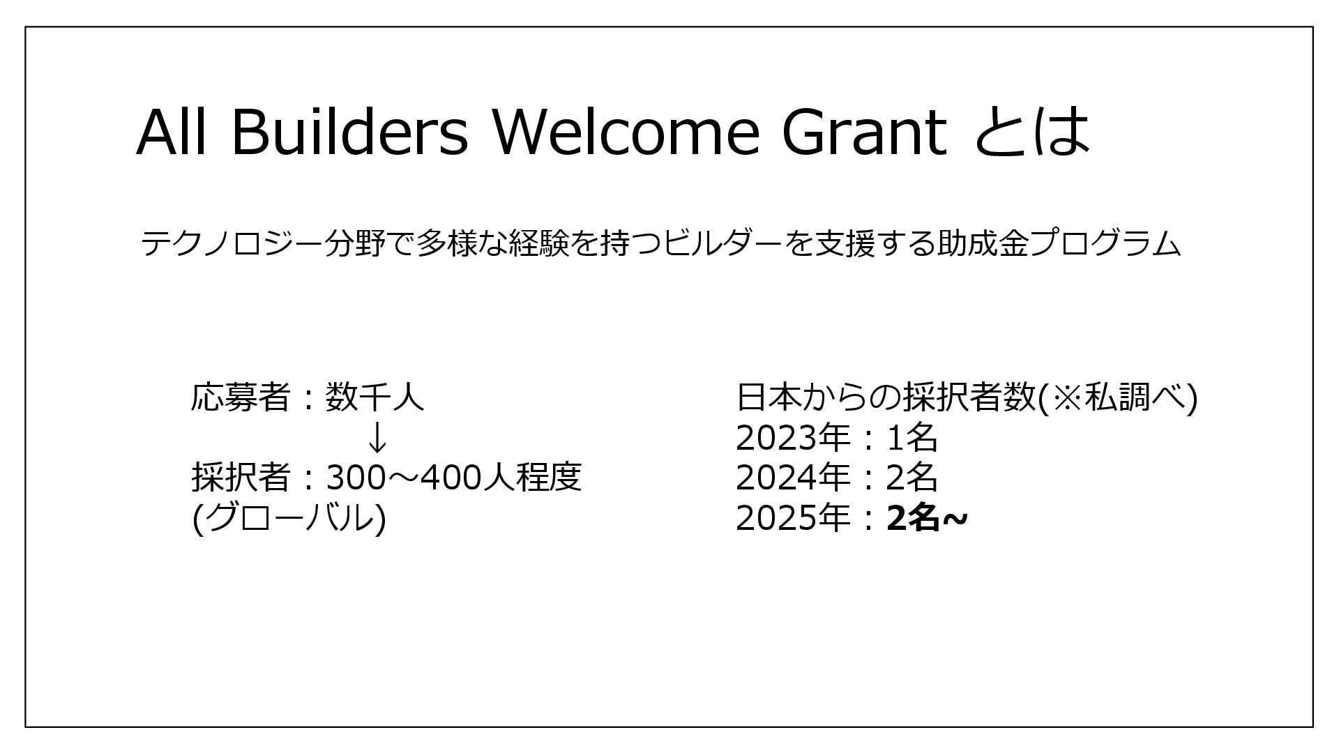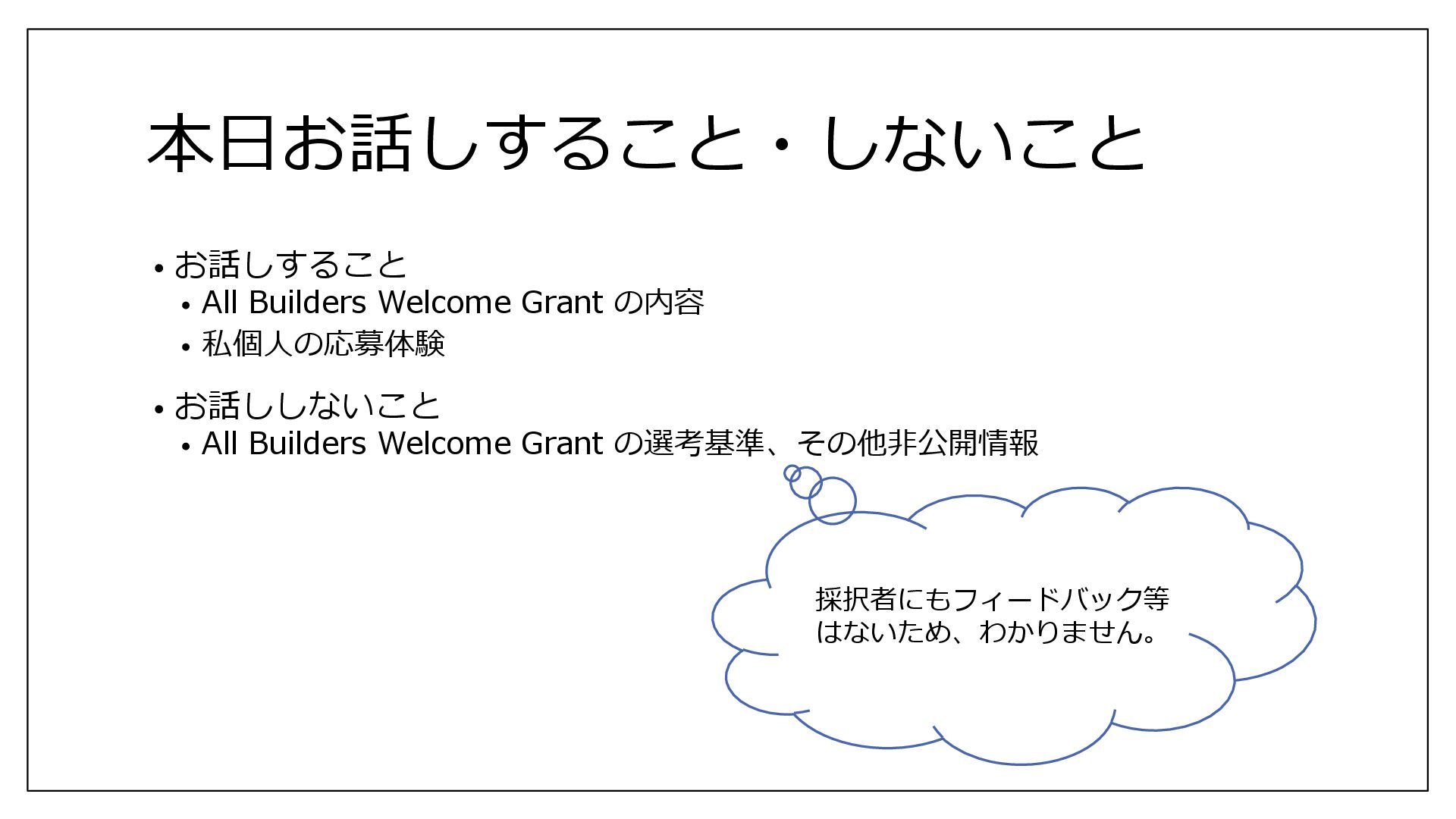 私個人の応募体験 • お話ししないこと • All Builders Welcome Grant の選考基準、その他非公開情報 採択者にもフィードバック等 はないため、わかりません。