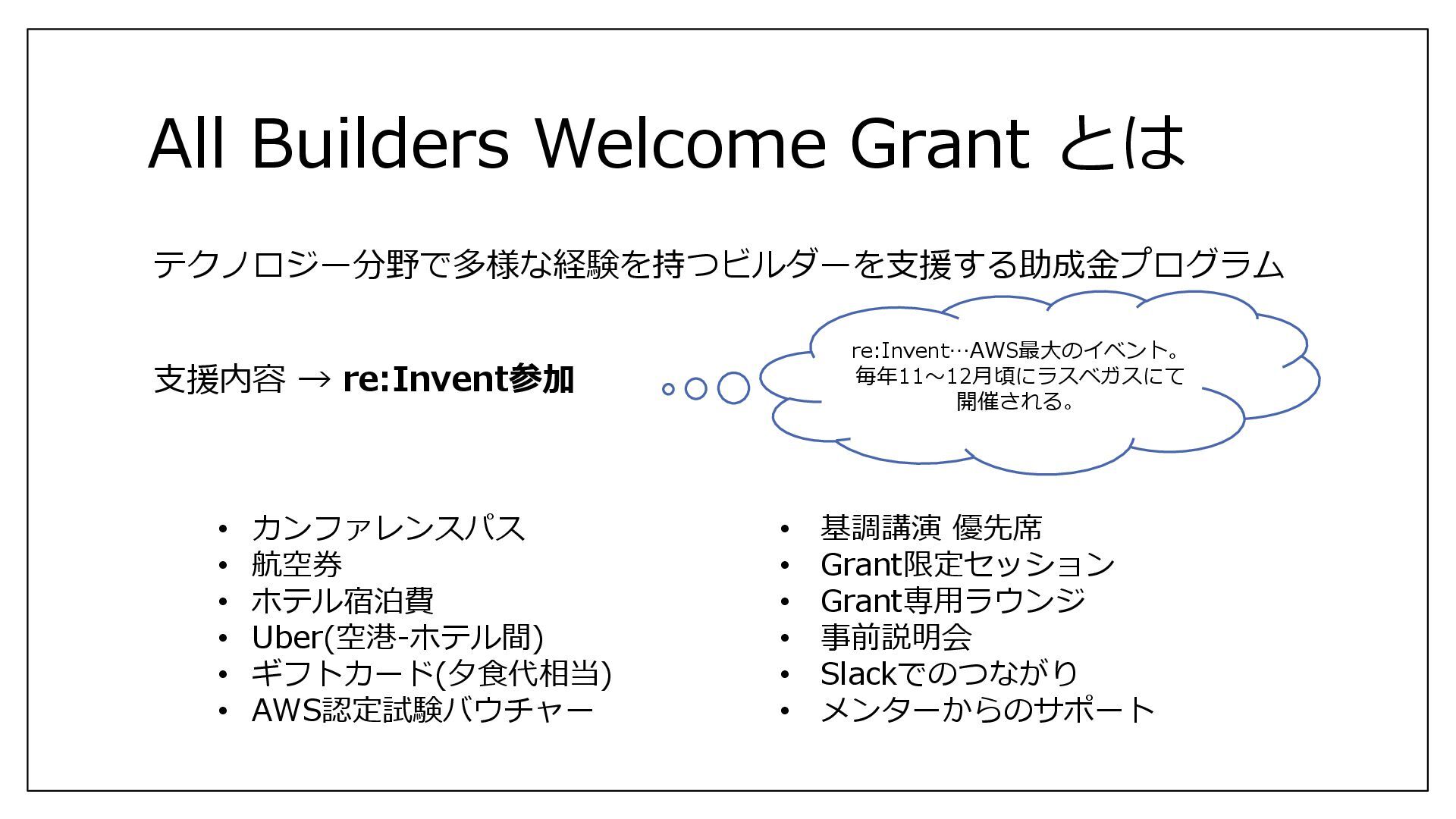 3. All Builders Welcome Grant とは テクノロジー分野で多様な経験を持つビルダーを支援する助成金プログラム 支援内容 → re:Invent参加 •