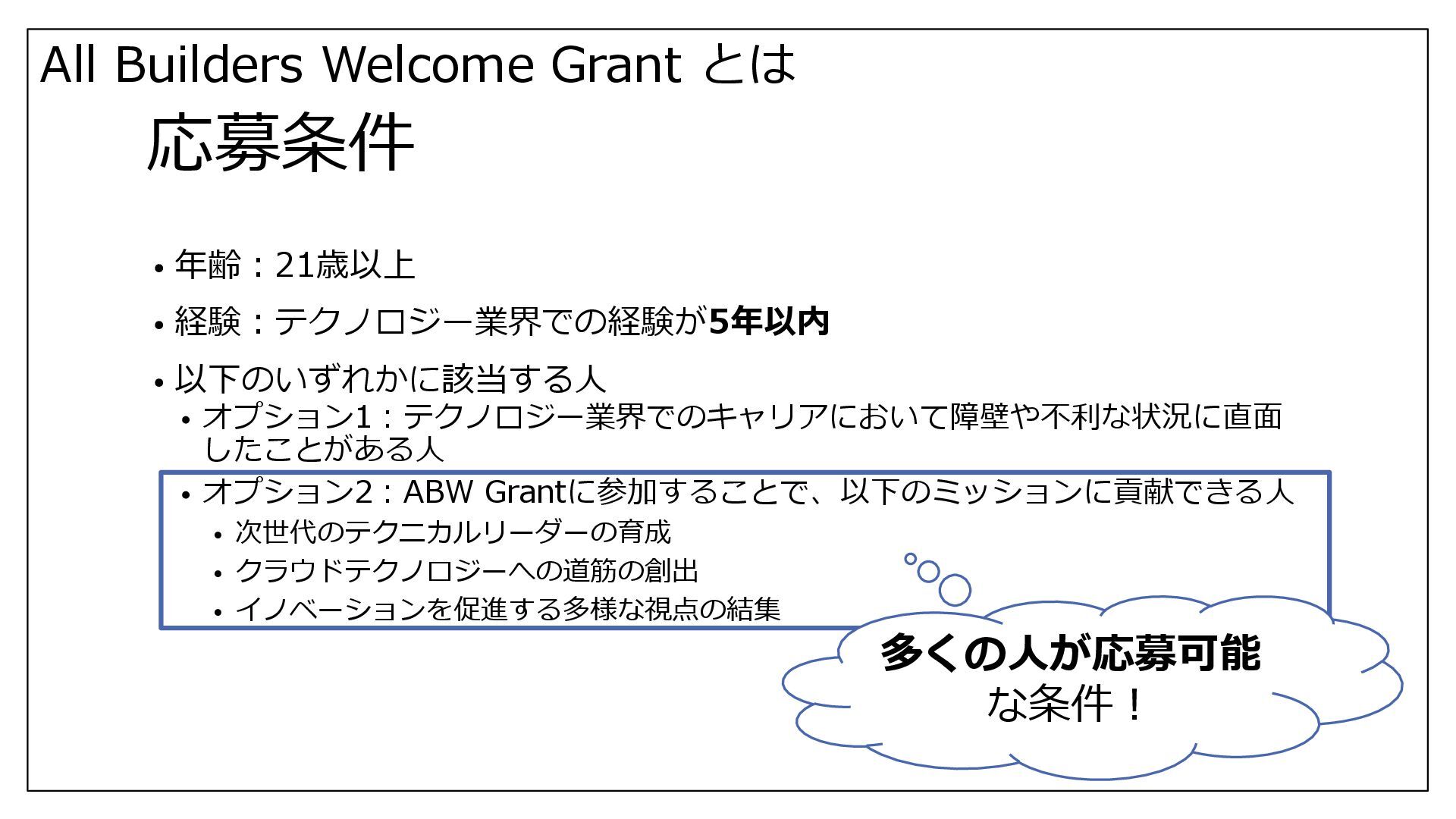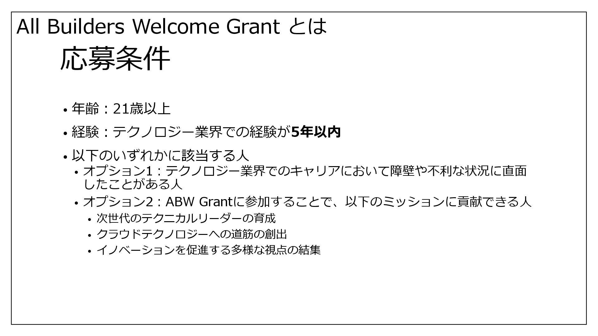 • オプション2:ABW Grantに参加することで、以下のミッションに貢献できる人 • 次世代のテクニカルリーダーの育成 • クラウドテクノロジーへの道筋の創出 • イノベーションを促進する多様な視点の結集 All Builders Welcome Grant とは 多くの人が応募可能 な条件!