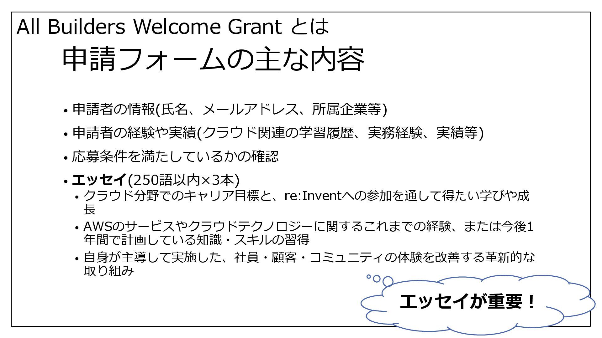 クラウド分野でのキャリア目標と、re:Inventへの参加を通して得たい学びや成 長 • AWSのサービスやクラウドテクノロジーに関するこれまでの経験、または今後1 年間で計画している知識・スキルの習得 • 自身が主導して実施した、社員・顧客・コミュニティの体験を改善する革新的な 取り組み エッセイが重要! All Builders Welcome Grant とは