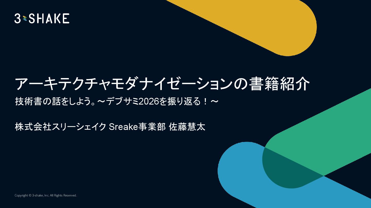 アーキテクチャモダナイゼーションの書籍紹介 技術書の話をしよう。~デブサミ2026を振り返る!~ 株式会社スリーシェイク Sreake事業部 佐藤慧太 Copyright © 3-shake, Inc. All