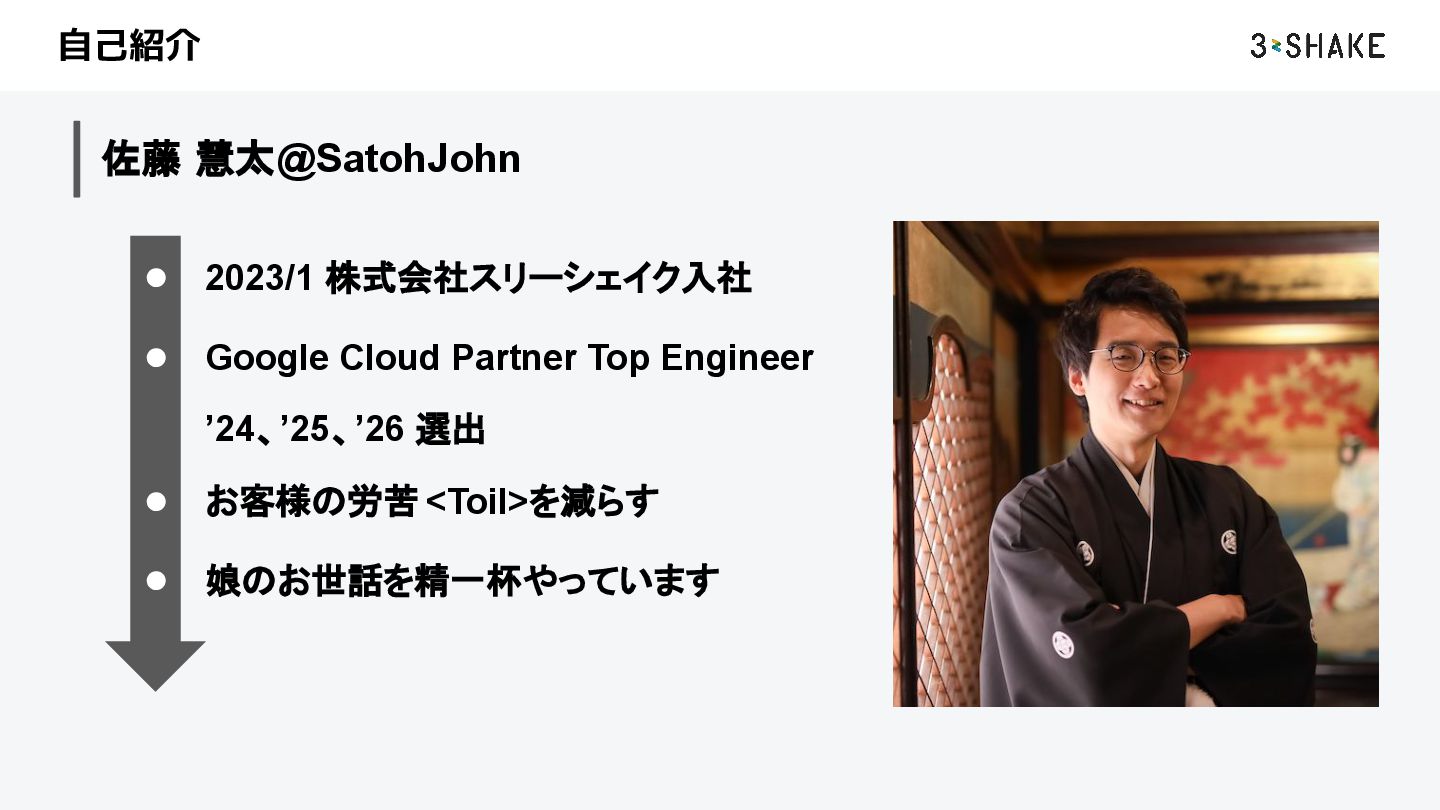 自己紹介 佐藤 慧太@SatohJohn • 2023/1 株式会社スリーシェイク入社 • Google Cloud Partner