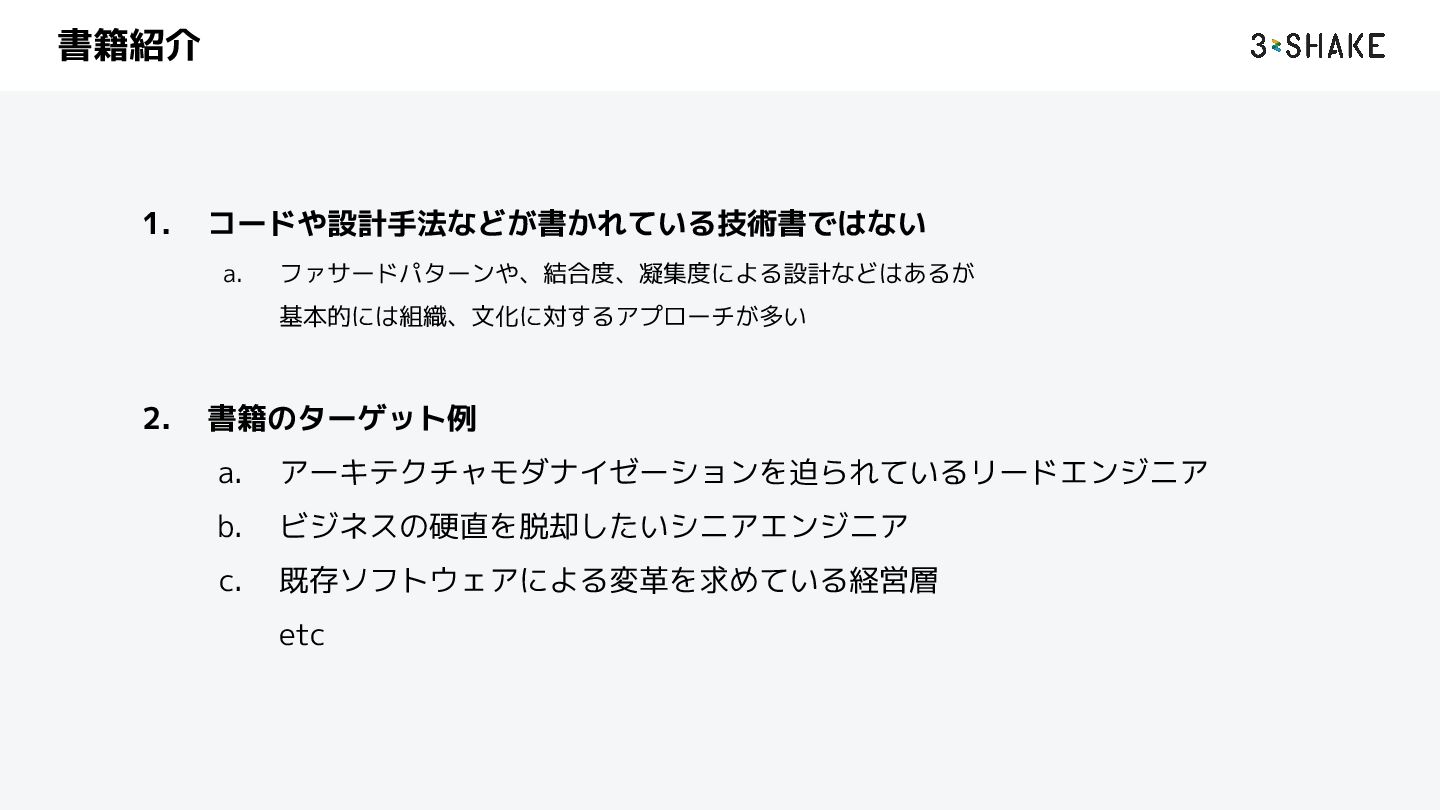 書籍紹介 1. コードや設計手法などが書かれている技術書ではない a. ファサードパターンや、結合度、凝集度による設計などはあるが 基本的には組織、文化に対するアプローチが多い 2. 書籍のターゲット例 a. アーキテクチャモダナイゼーションを迫られているリードエンジニア