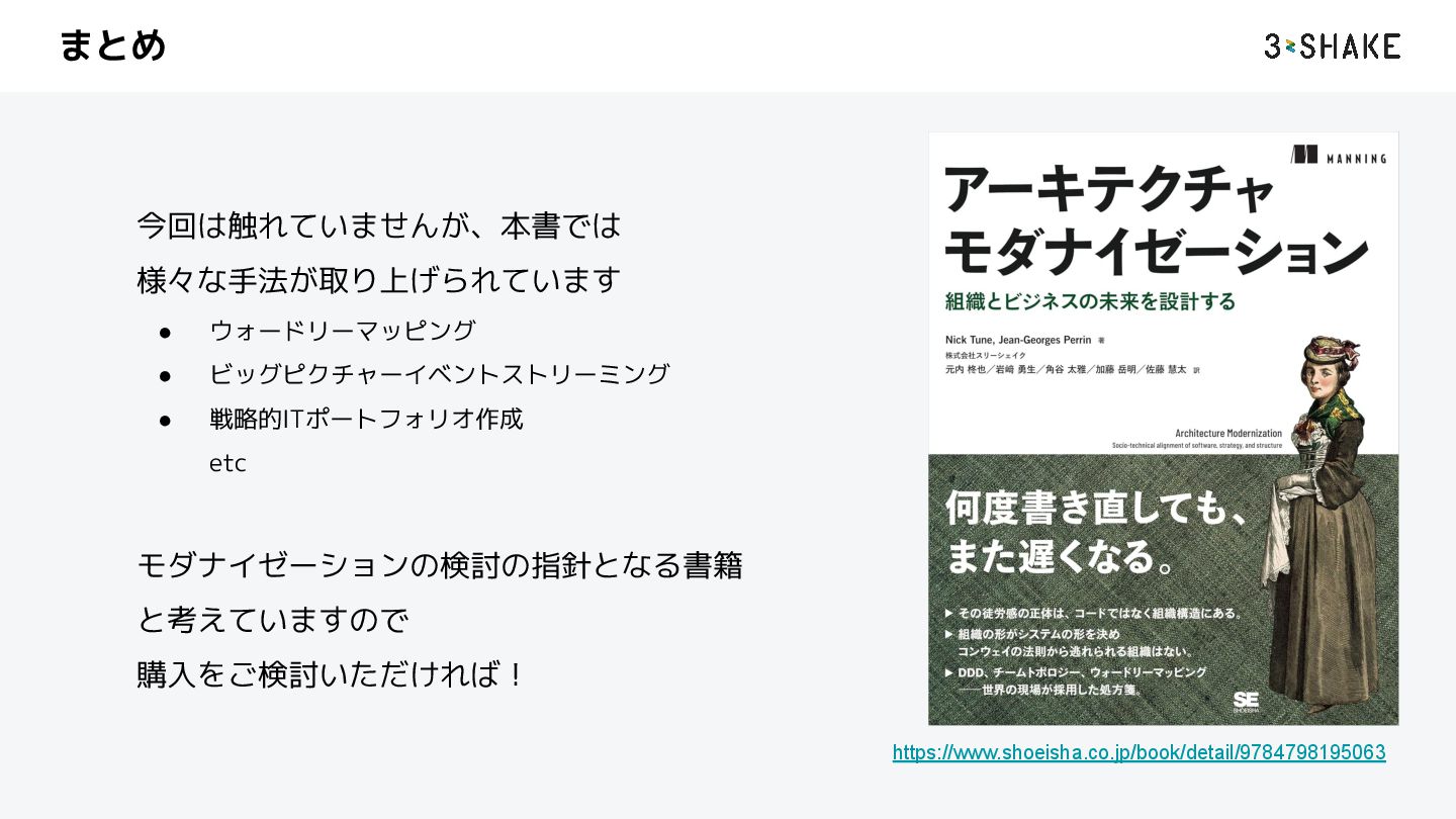 モダナイゼーションの検討の指針となる書籍 と考えていますので 購入をご検討いただければ! https://www.shoeisha.co.jp/book/detail/9784798195063