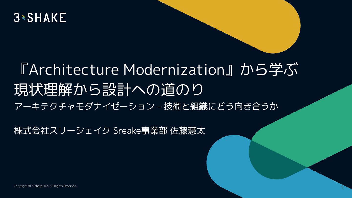 『Architecture Modernization』から学ぶ 現状理解から設計への道のり アーキテクチャモダナイゼーション - 技術と組織にどう向き合うか 株式会社スリーシェイク Sreake事業部 佐藤慧太 Copyright