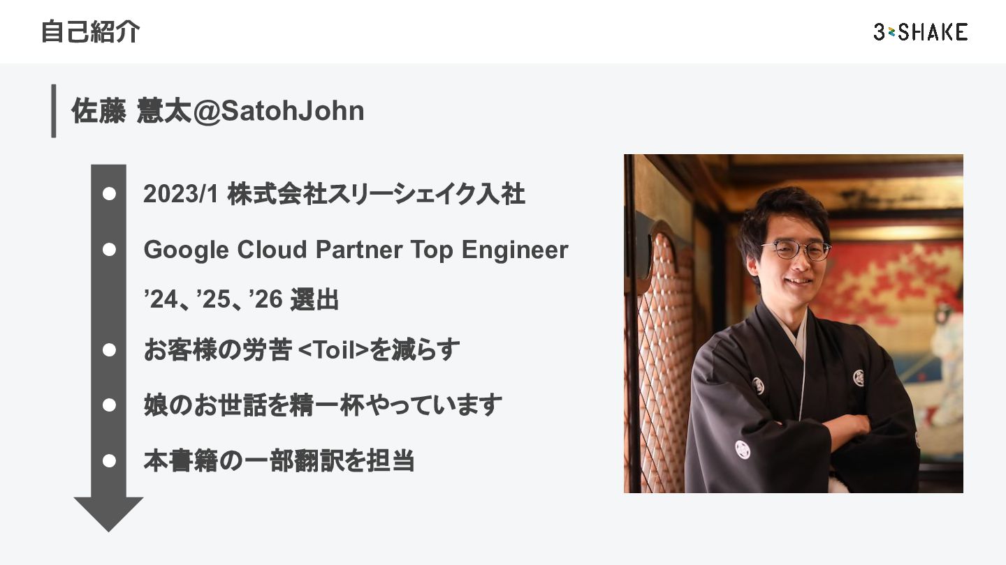 Top Engineer ’24、’25、’26 選出 • お客様の労苦 <Toil>を減らす • 娘のお世話を精一杯やっています • 本書籍の一部翻訳を担当
