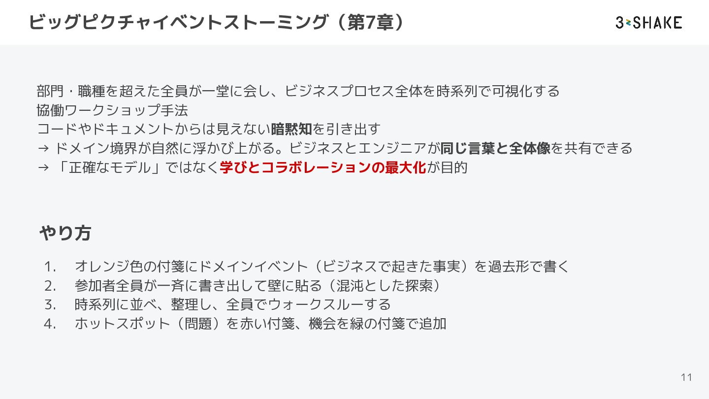 オレンジ色の付箋にドメインイベント(ビジネスで起きた事実)を過去形で書く 2. 参加者全員が一斉に書き出して壁に貼る(混沌とした探索) 3. 時系列に並べ、整理し、全員でウォークスルーする 4. ホットスポット(問題)を赤い付箋、機会を緑の付箋で追加 やり方
