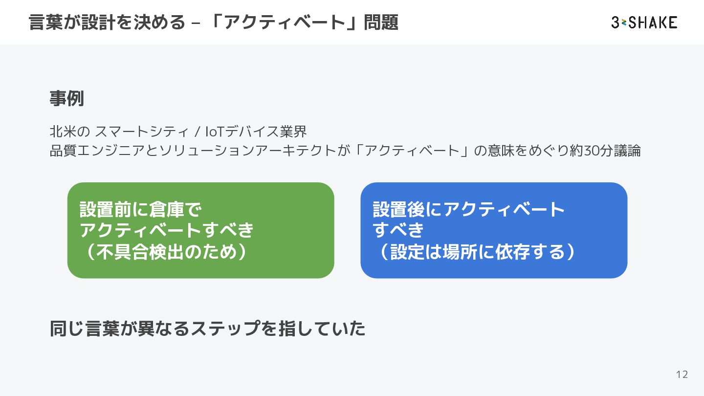 言葉が設計を決める – 「アクティベート」問題 12 事例 北米の スマートシティ / IoTデバイス業界 品質エンジニアとソリューションアーキテクトが「アクティベート」の意味をめぐり約30分議論