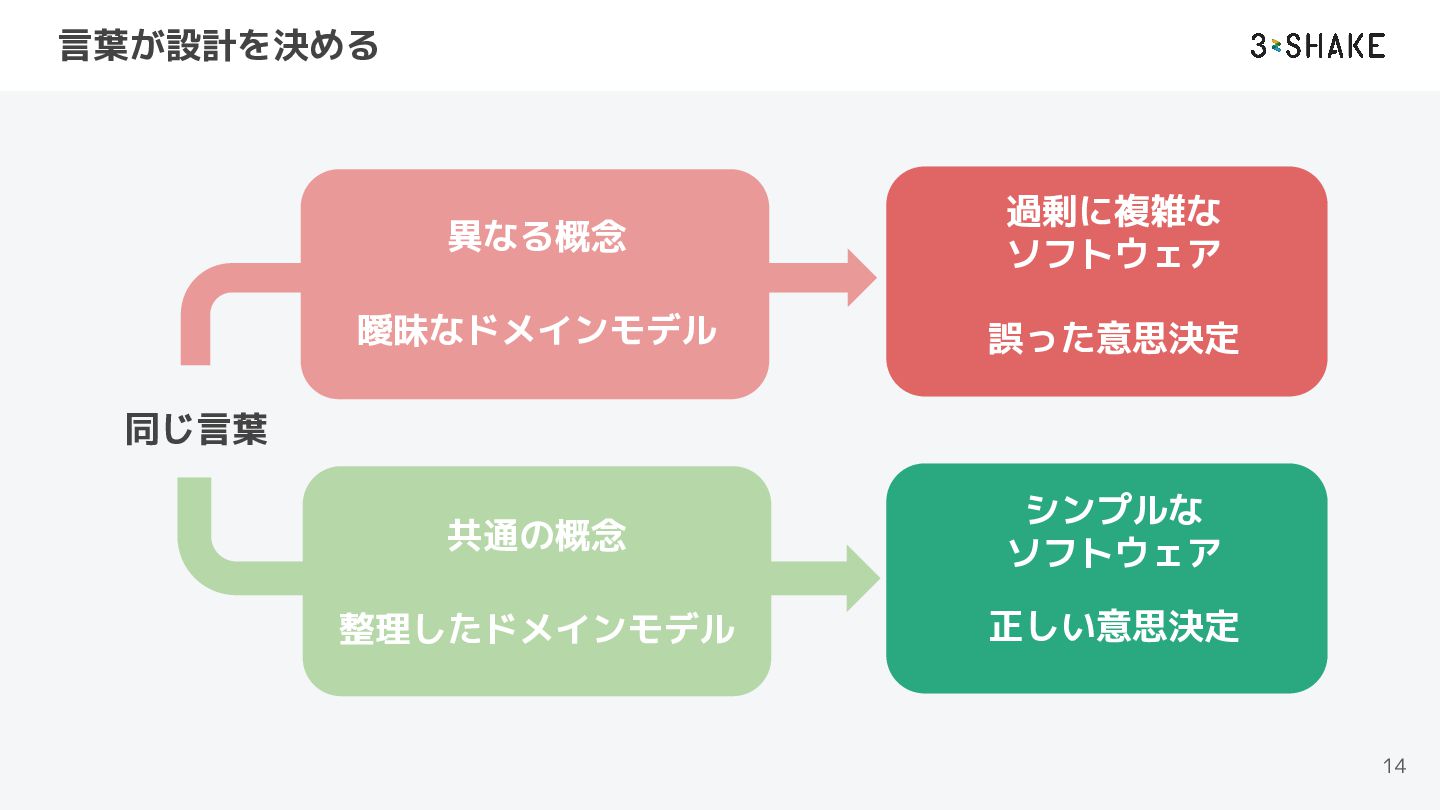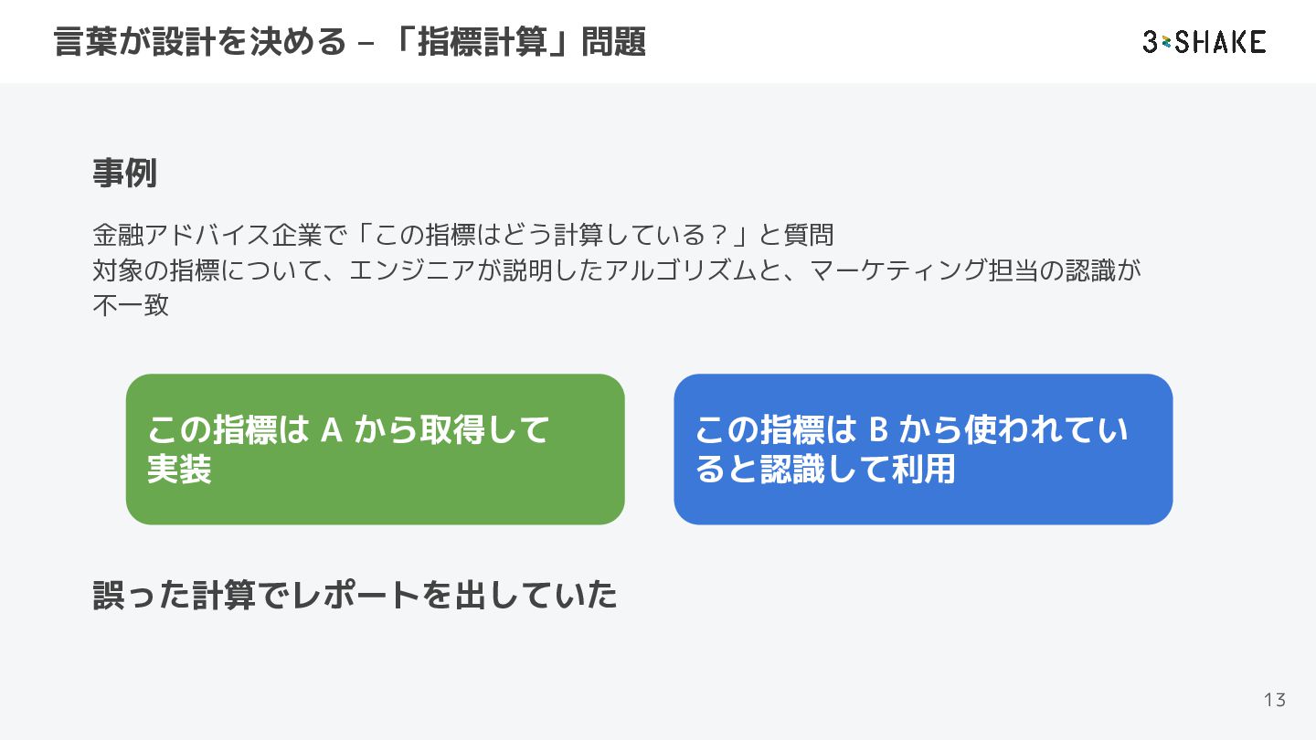 言葉が設計を決める – 「指標計算」問題 13 事例 金融アドバイス企業で「この指標はどう計算している?」と質問 対象の指標について、エンジニアが説明したアルゴリズムと、マーケティング担当の認識が 不一致 誤った計算でレポートを出していた この指標は