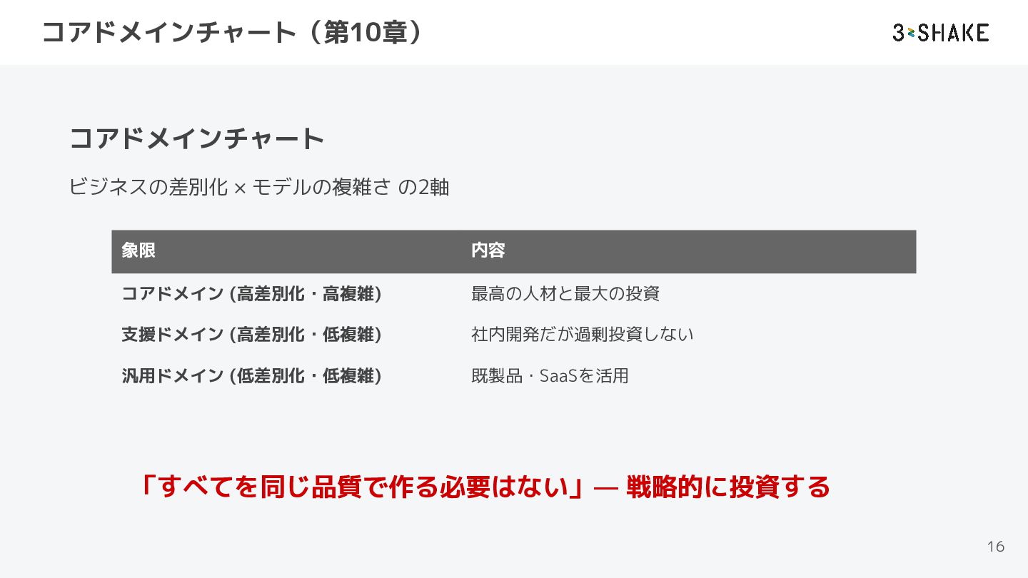 (高差別化・高複雑) 最高の人材と最大の投資 支援ドメイン (高差別化・低複雑) 社内開発だが過剰投資しない 汎用ドメイン (低差別化・低複雑) 既製品・SaaSを活用 「すべてを同じ品質で作る必要はない」— 戦略的に投資する