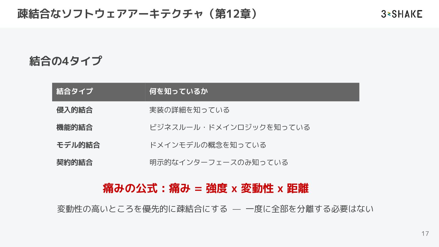 ドメインモデルの概念を知っている 契約的結合 明示的なインターフェースのみ知っている 痛みの公式 : 痛み = 強度 x 変動性 x 距離 変動性の高いところを優先的に疎結合にする — 一度に全部を分離する必要はない